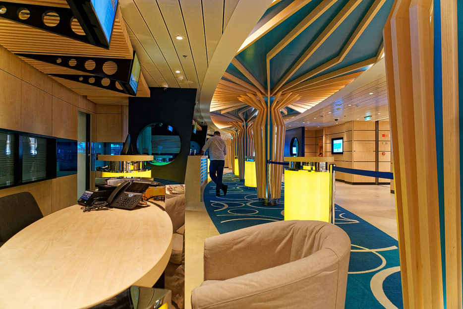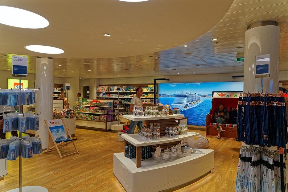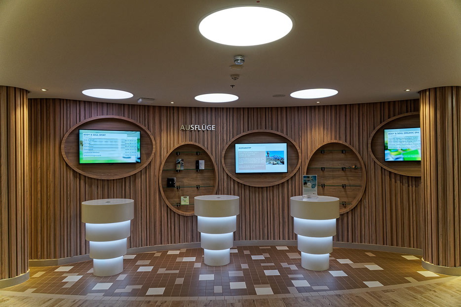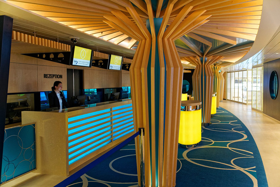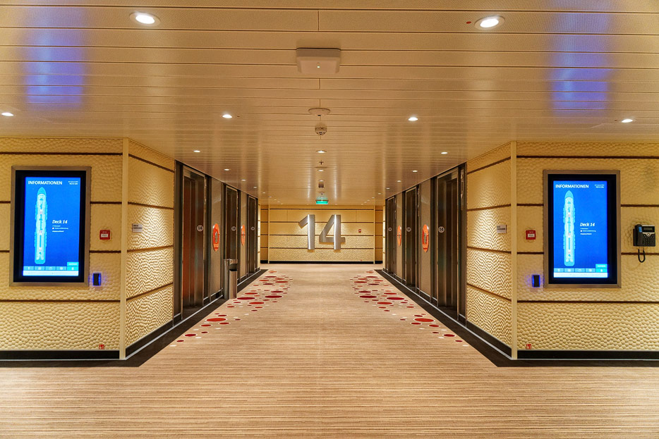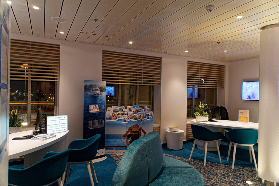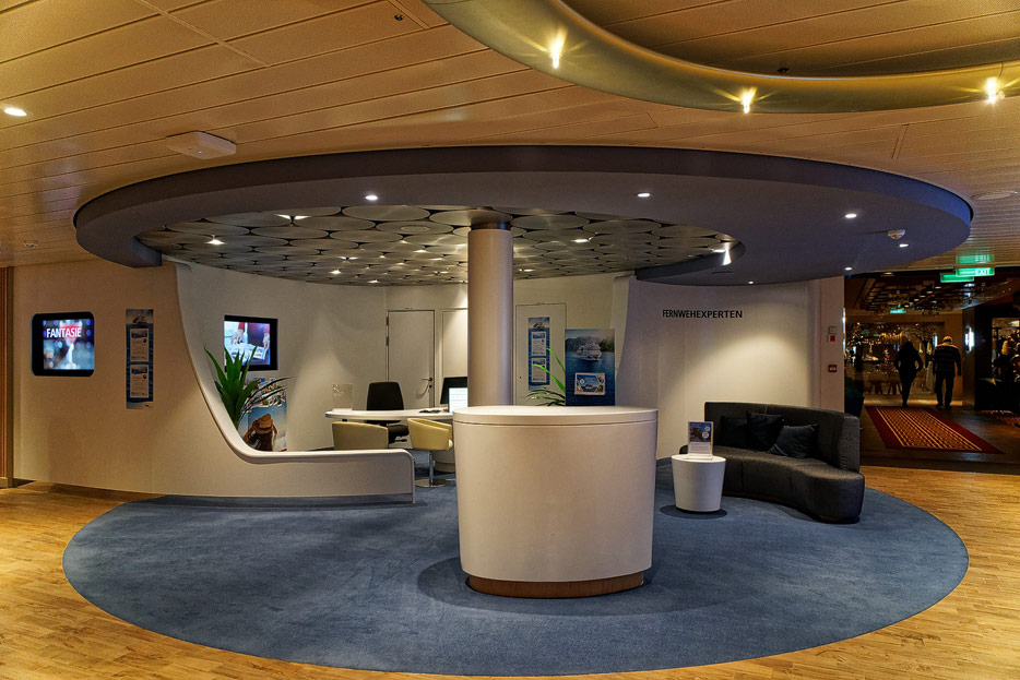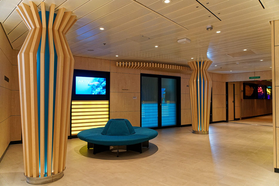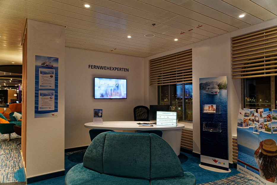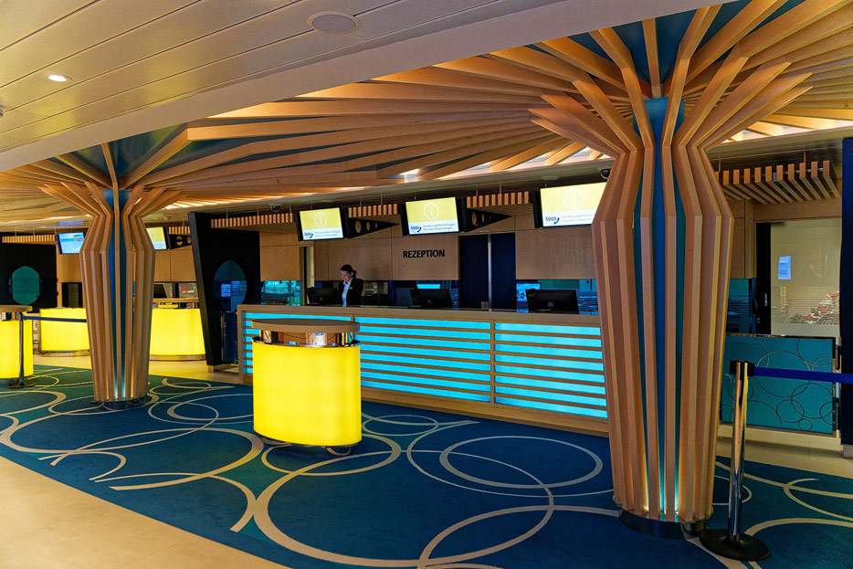Bilder sonstiger Bereiche auf der AIDAnova, u.a. Rezeption, Shops, Waschsalon, Treppenhäuser und Aufzüge