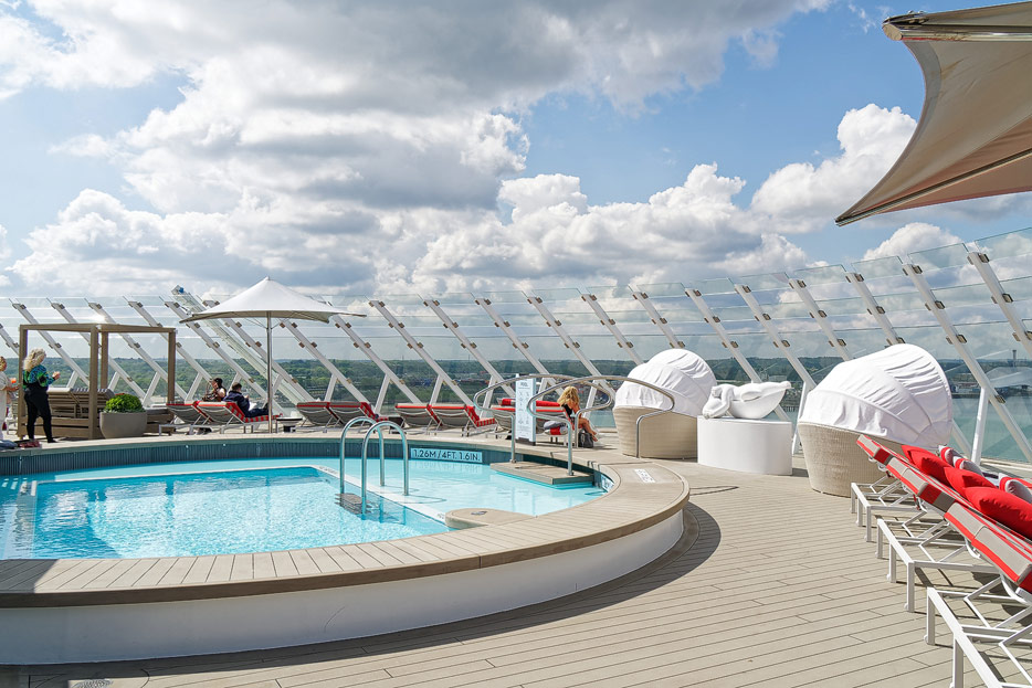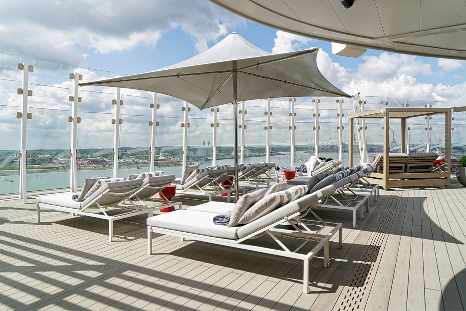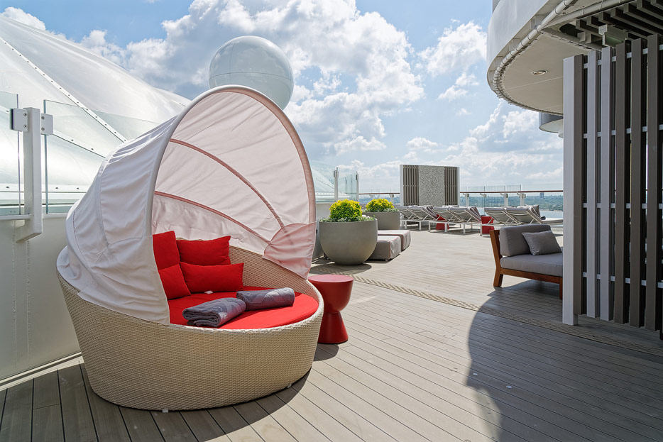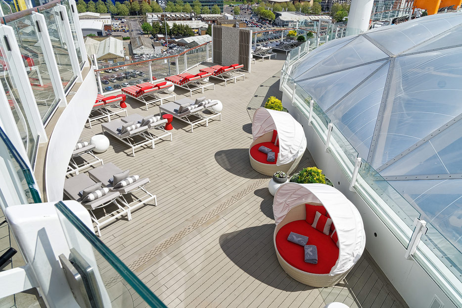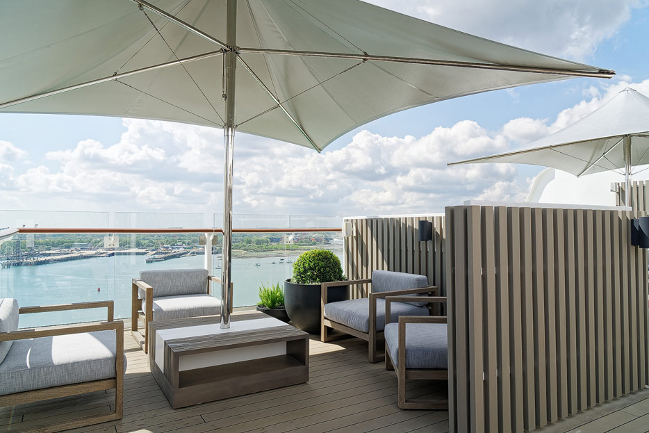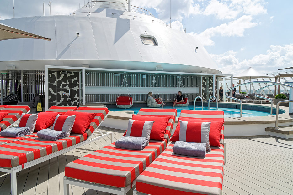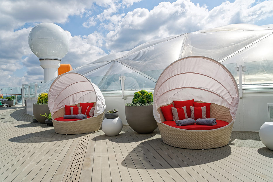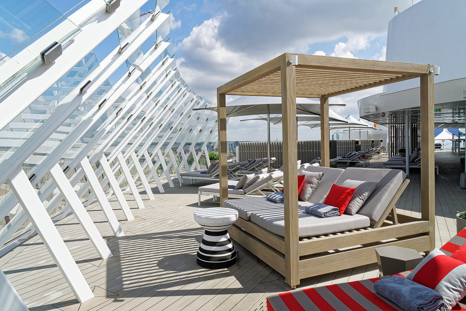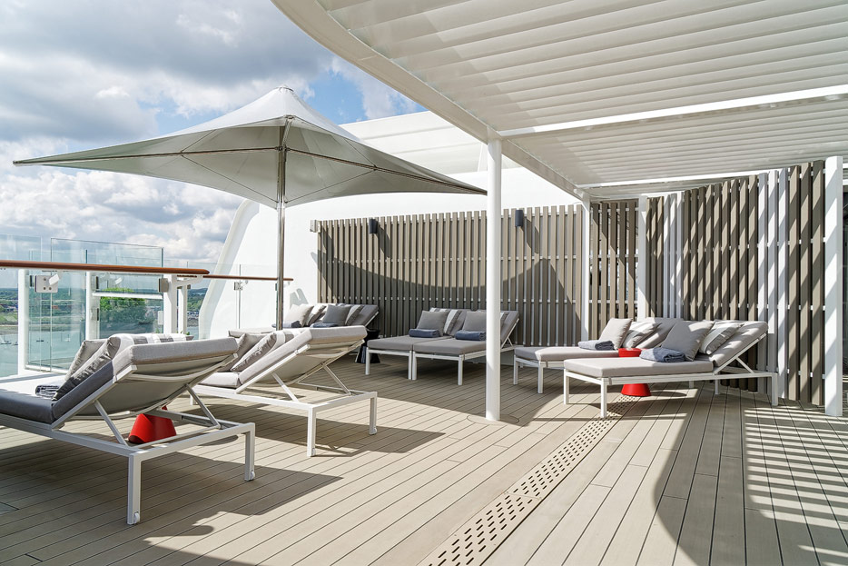 Bilder aus dem Suiten-Bereich "The Retreat" der Celebrity Beyond: Suite Lounge, Suite Sundeck; siehe auch "Restaurants" für der Suiten-Restaurant Luminae