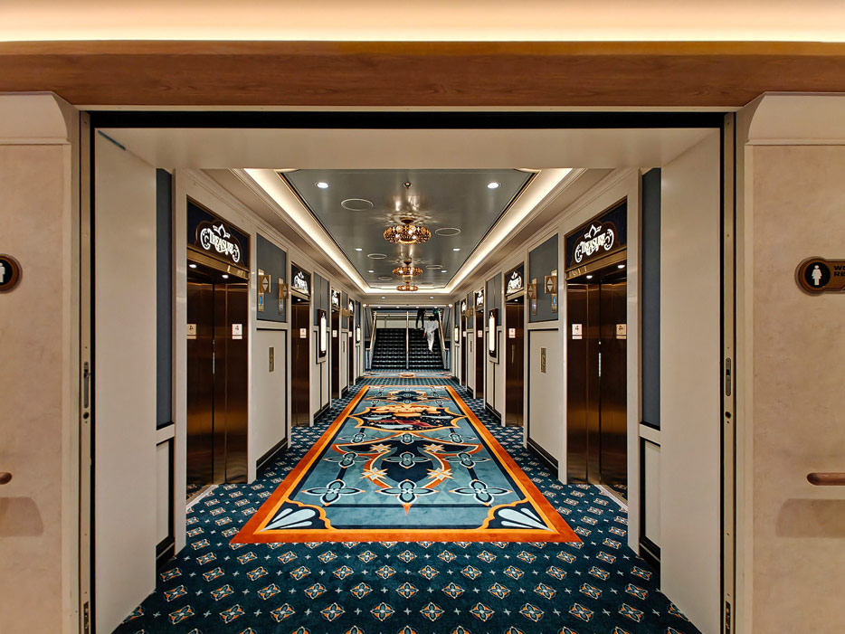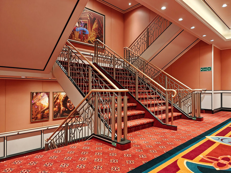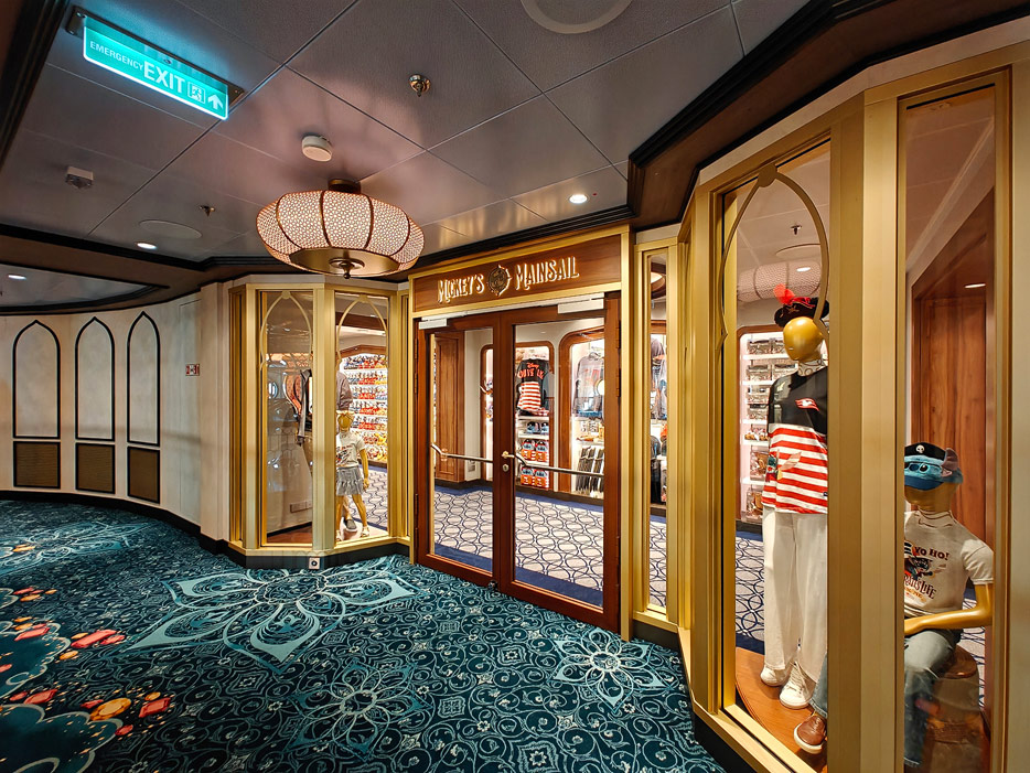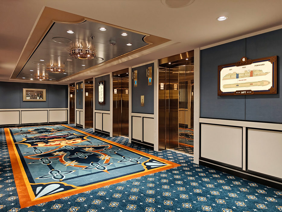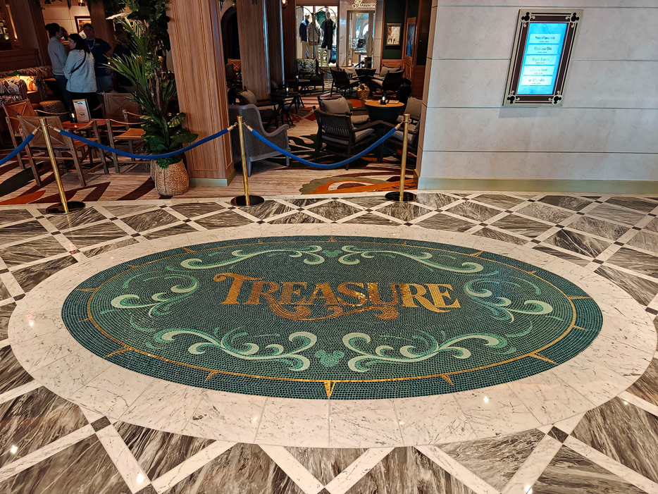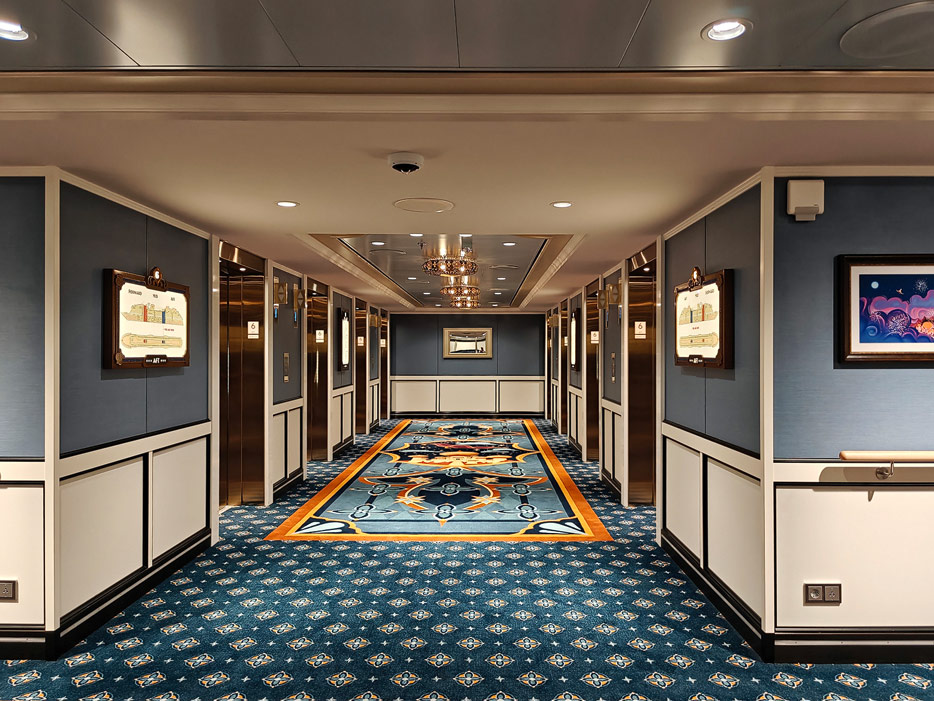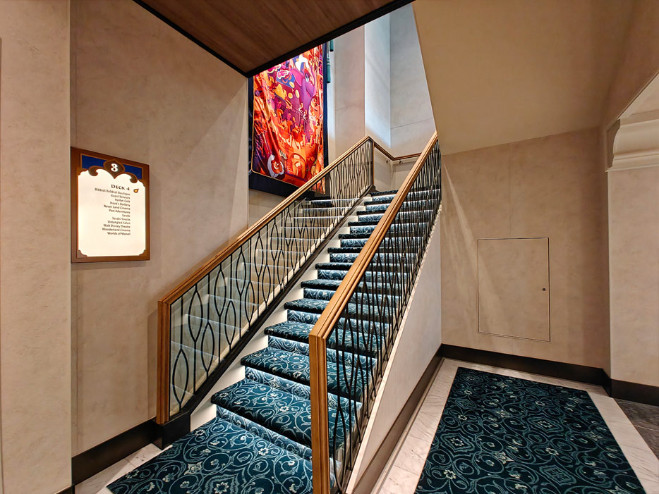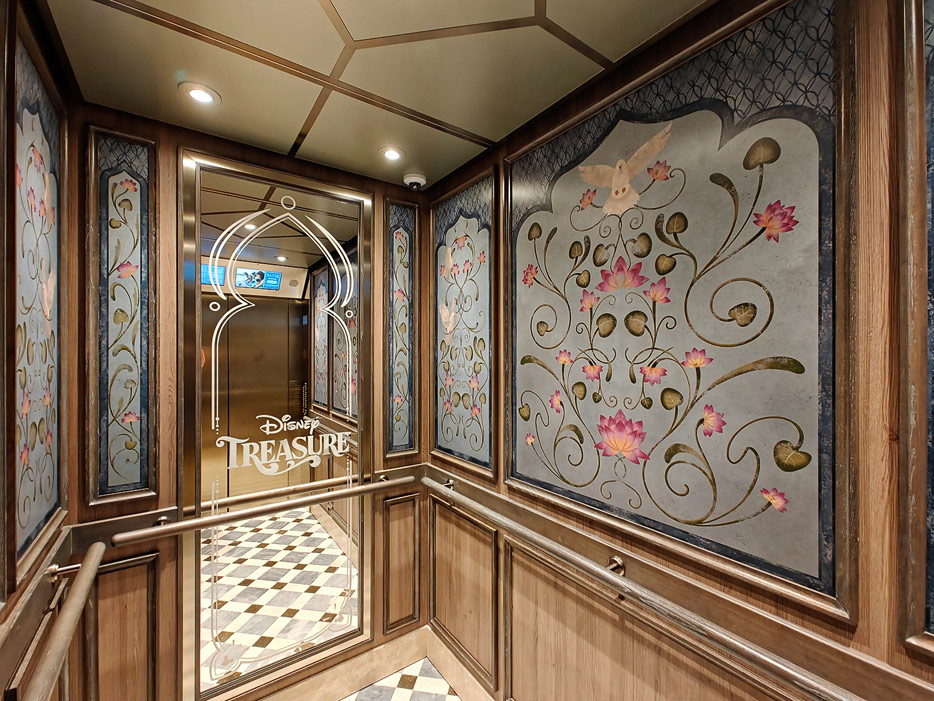 Bilder weiterer Bereiche der Disney Treasure: Treppenhaus, Aufzüge, Orientierung, Kunstwerke, Shops, Guest Services, Disney-Charaktere