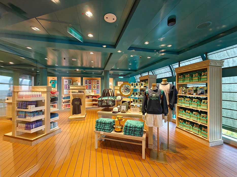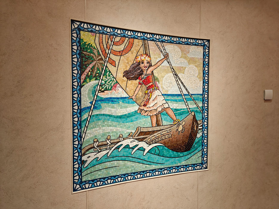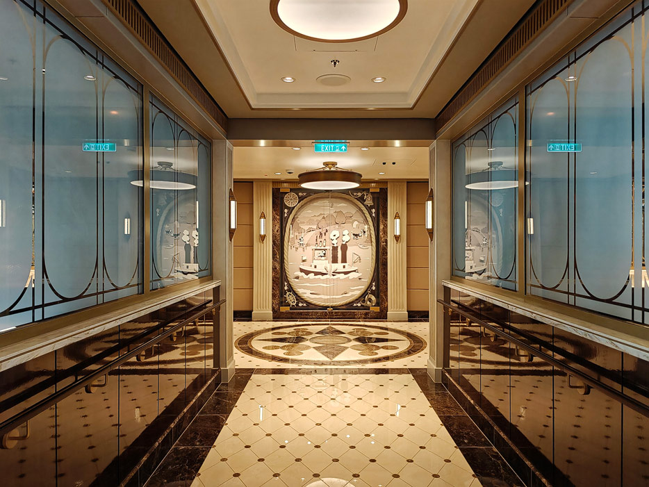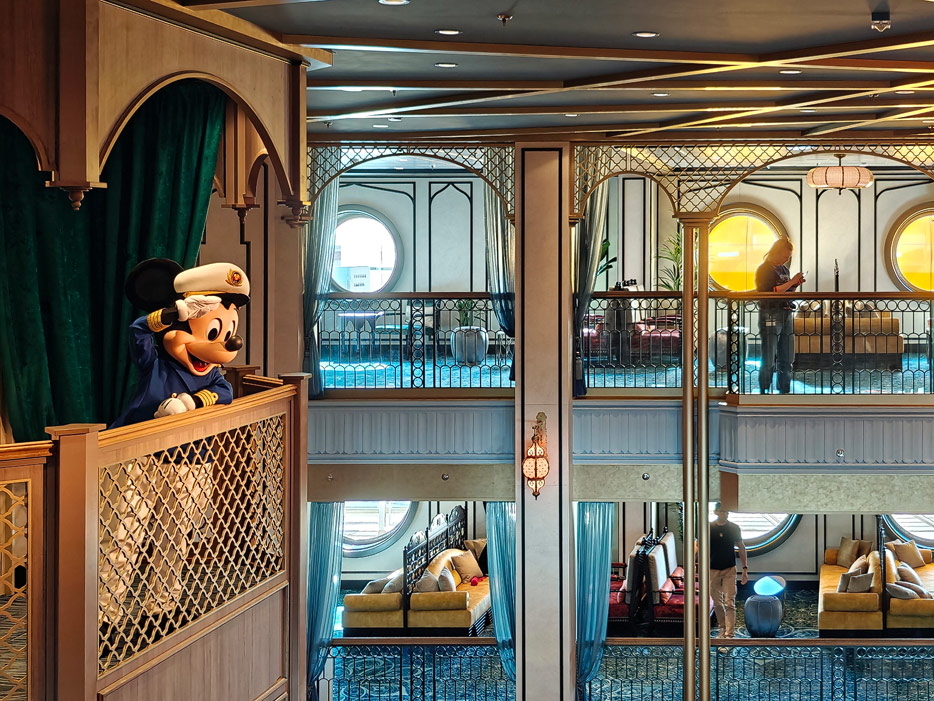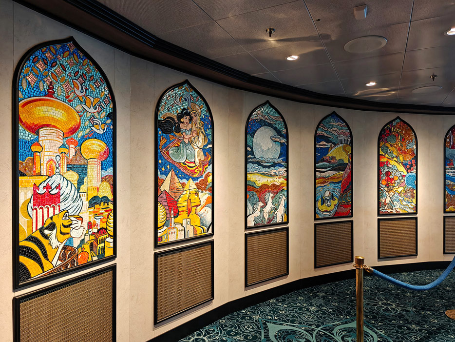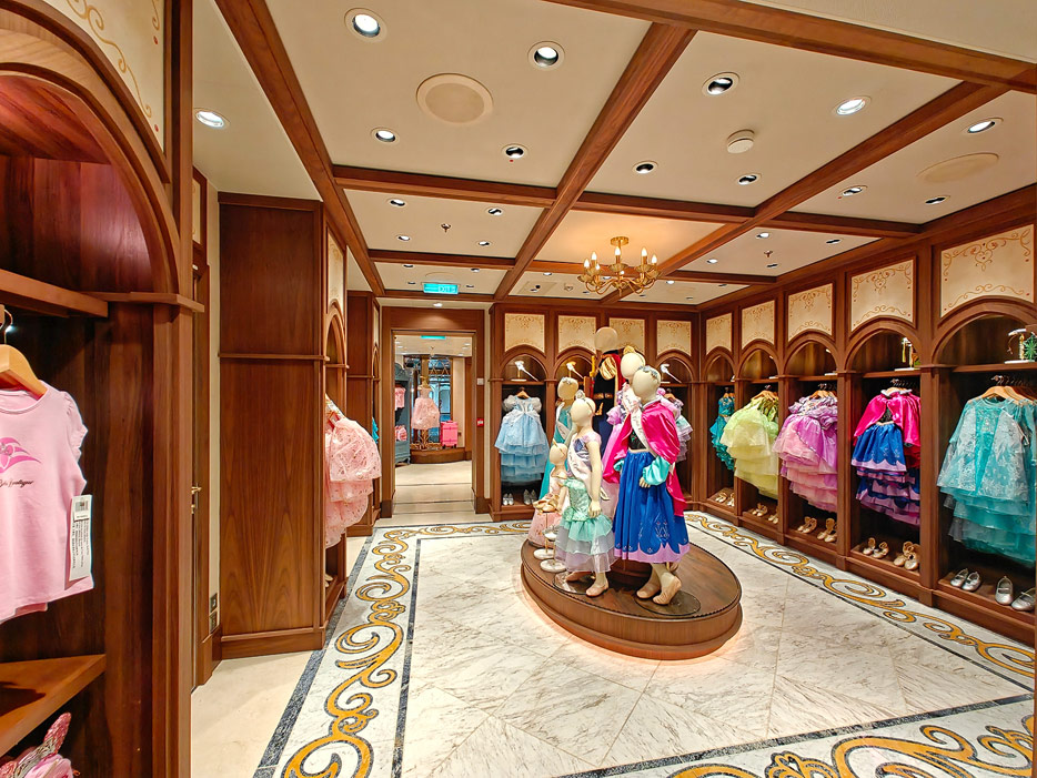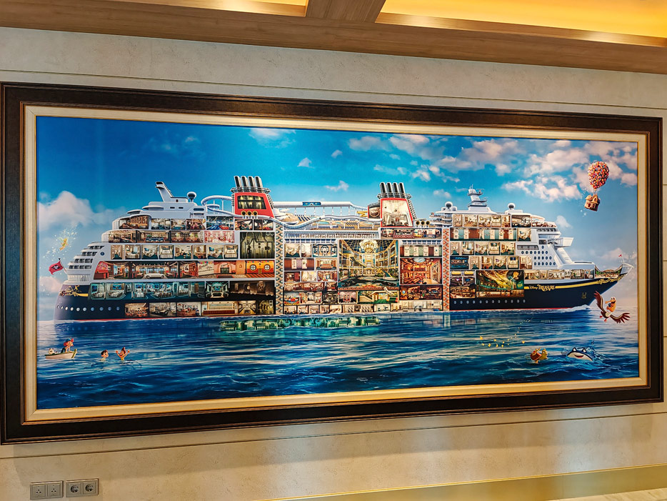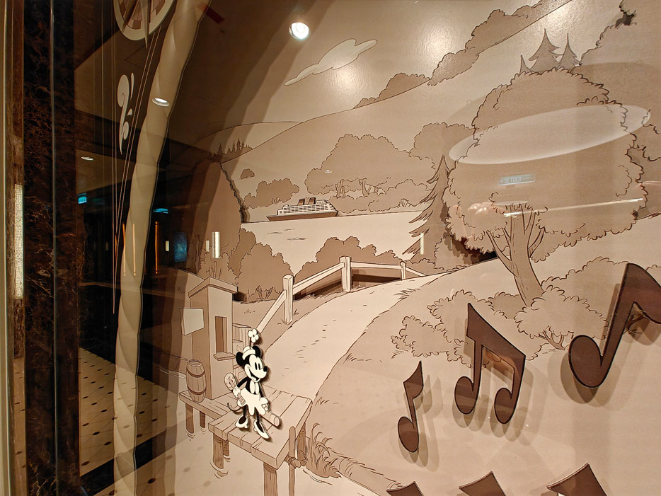 Bilder weiterer Bereiche der Disney Treasure: Treppenhaus, Aufzüge, Orientierung, Kunstwerke, Shops, Guest Services, Disney-Charaktere