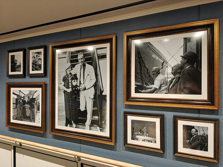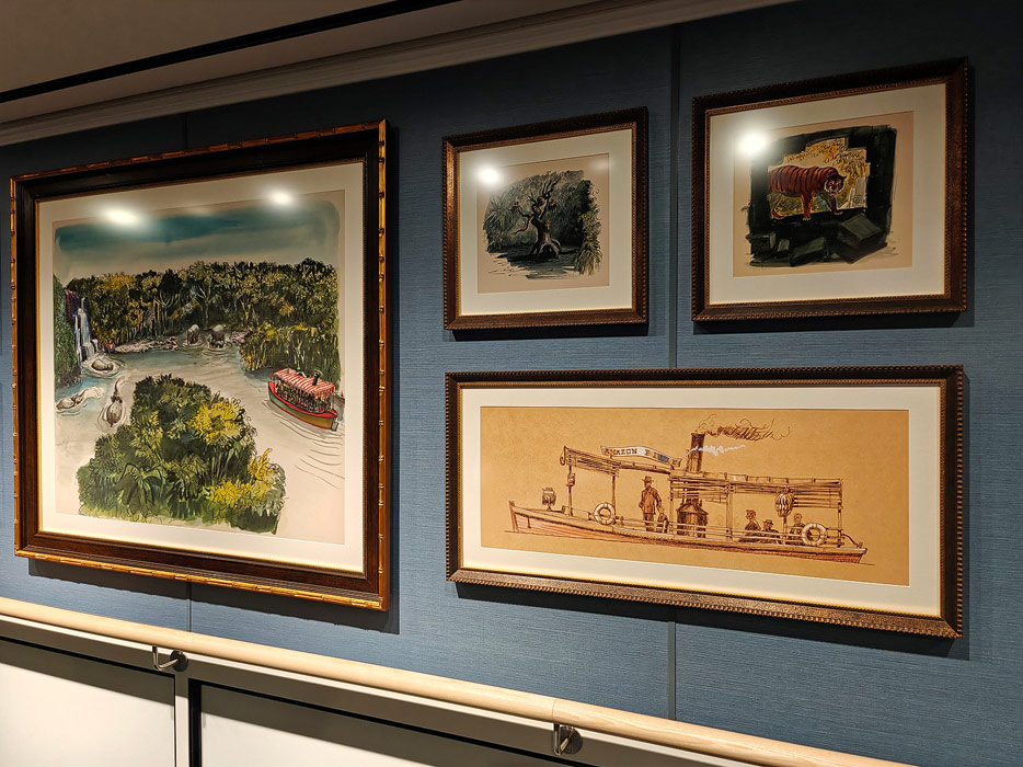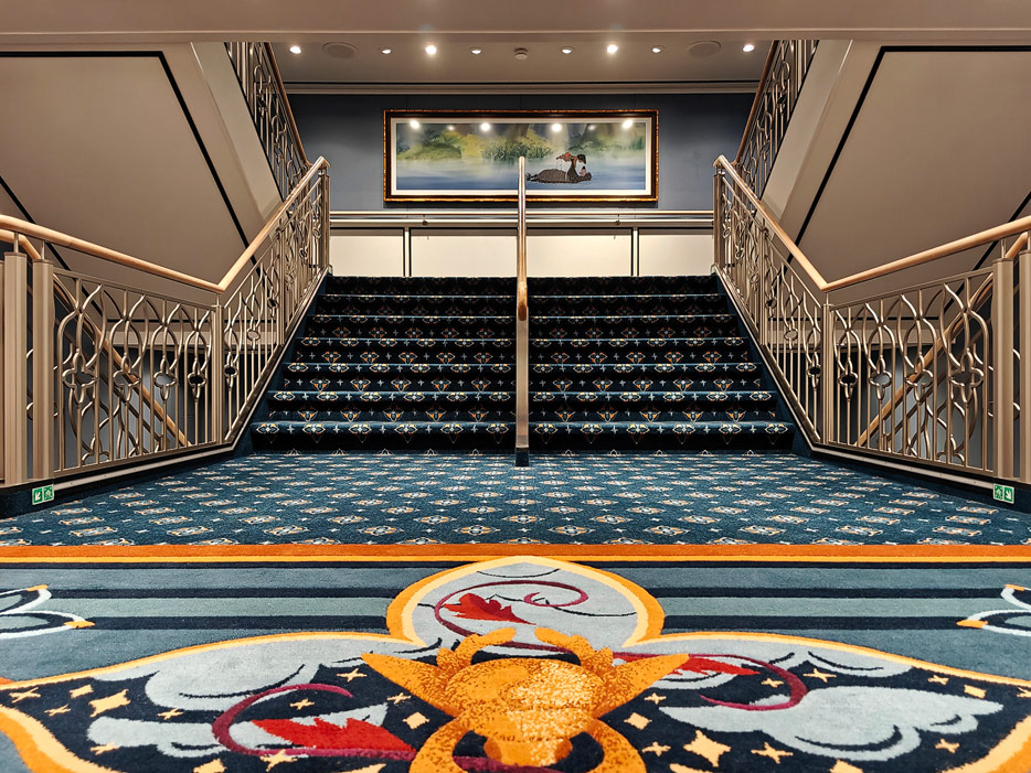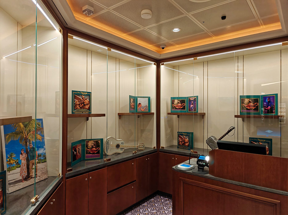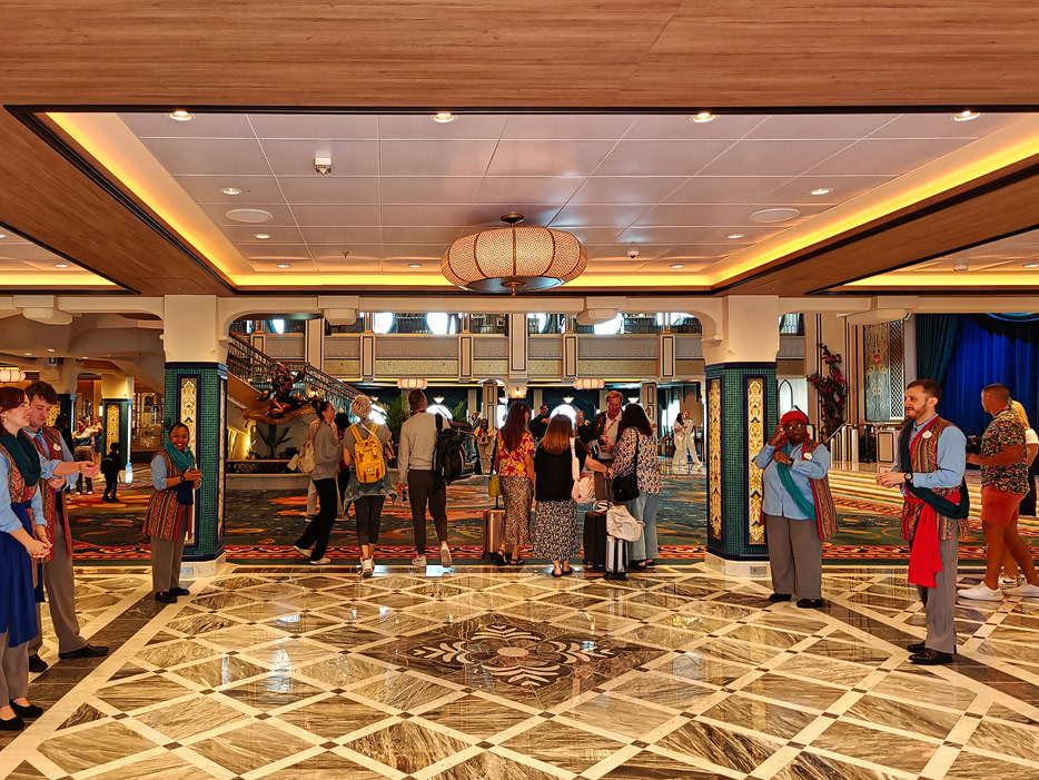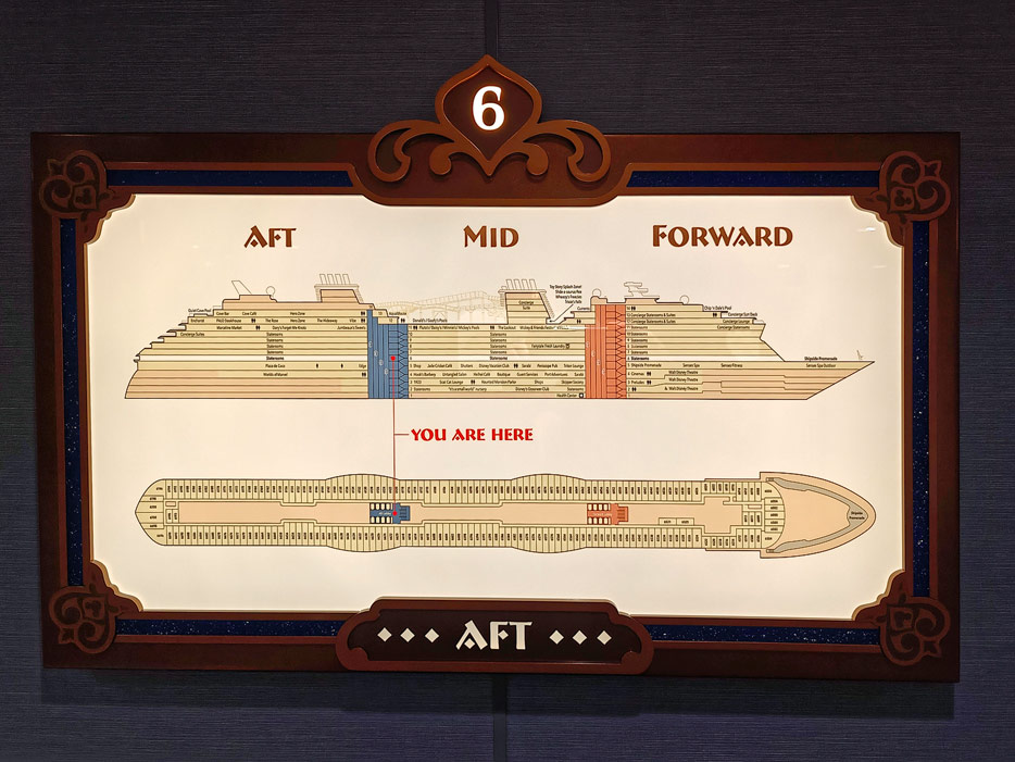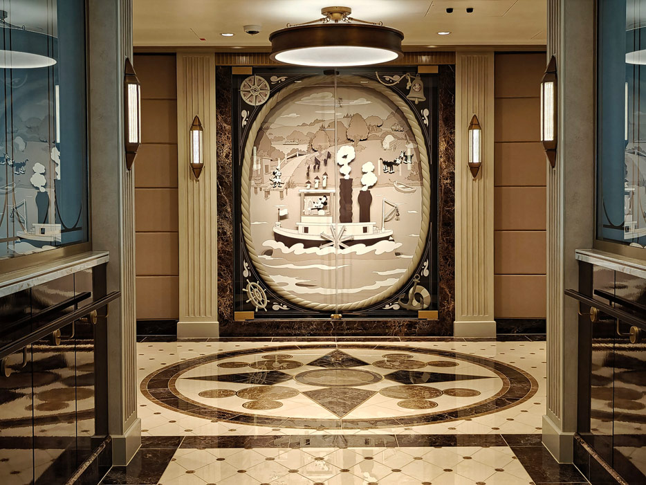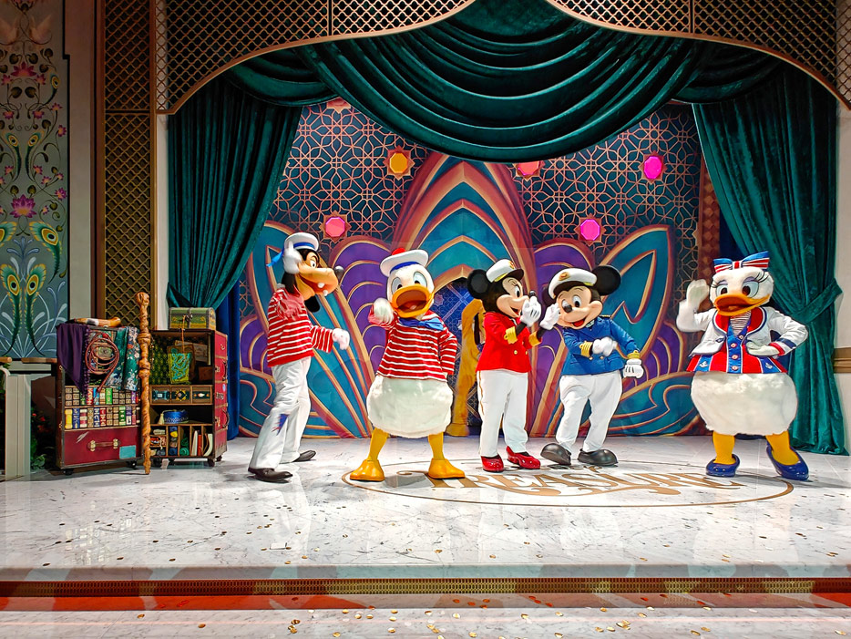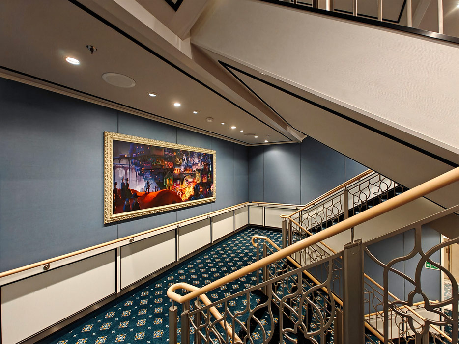 Bilder weiterer Bereiche der Disney Treasure: Treppenhaus, Aufzüge, Orientierung, Kunstwerke, Shops, Guest Services, Disney-Charaktere