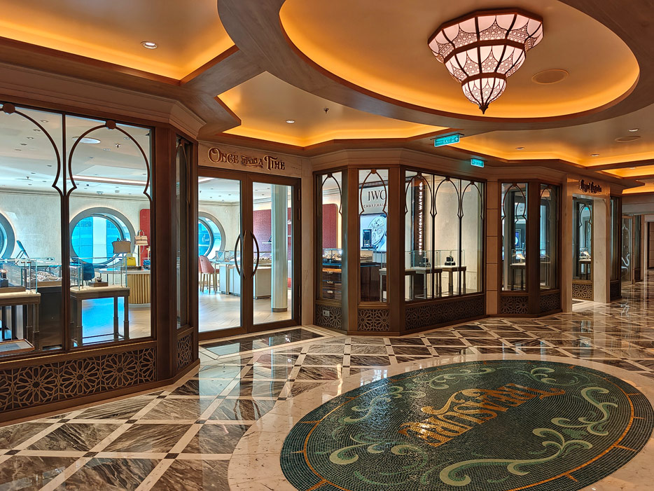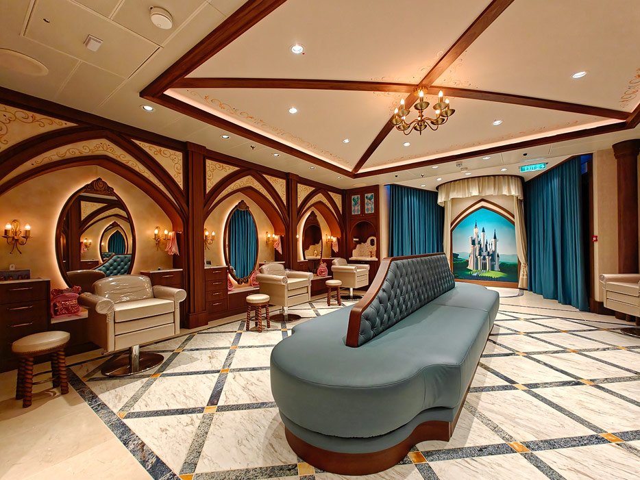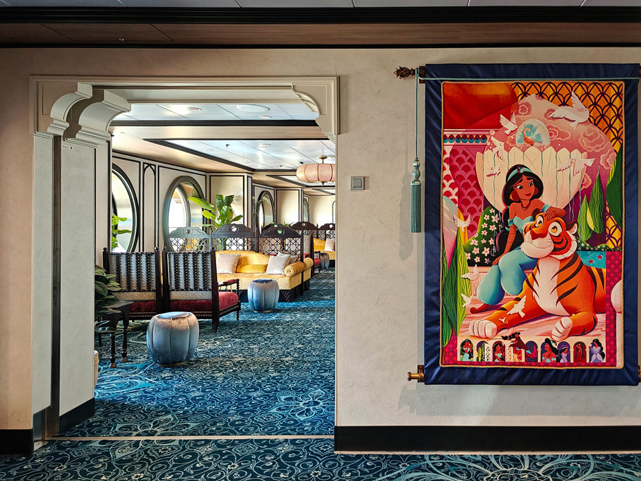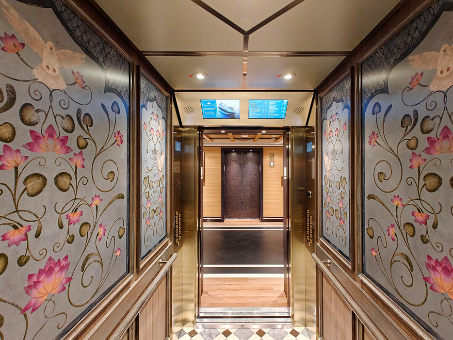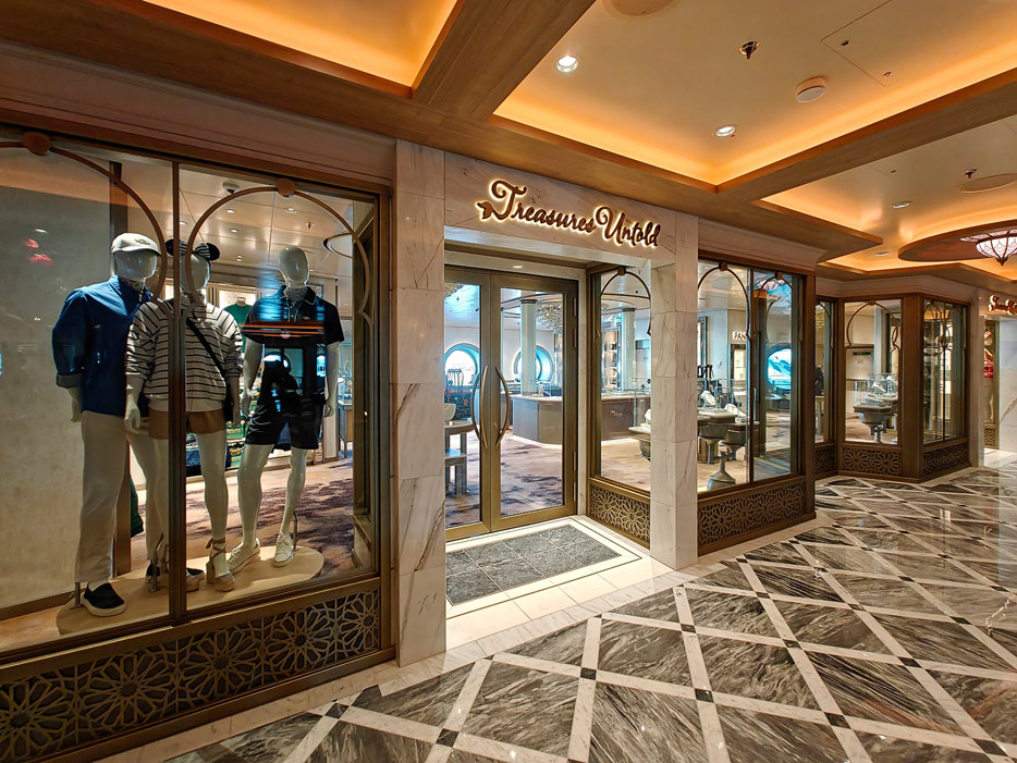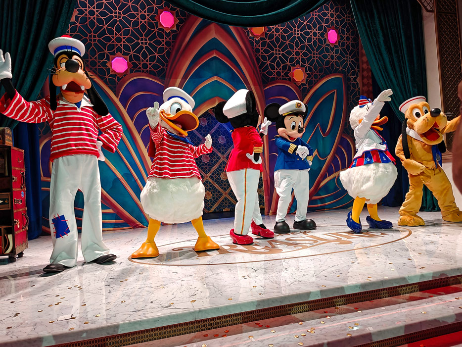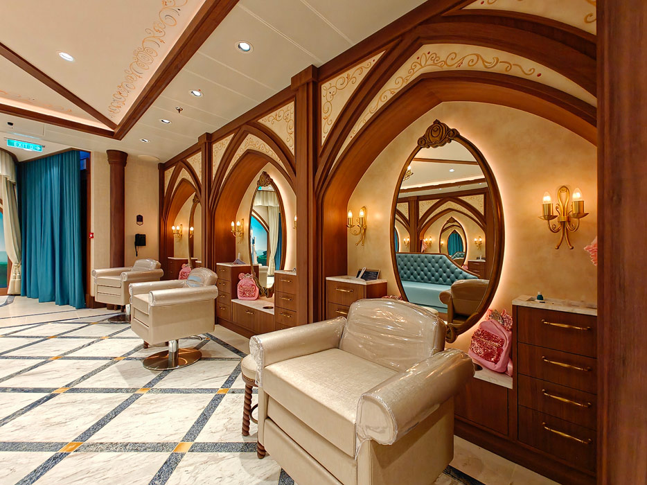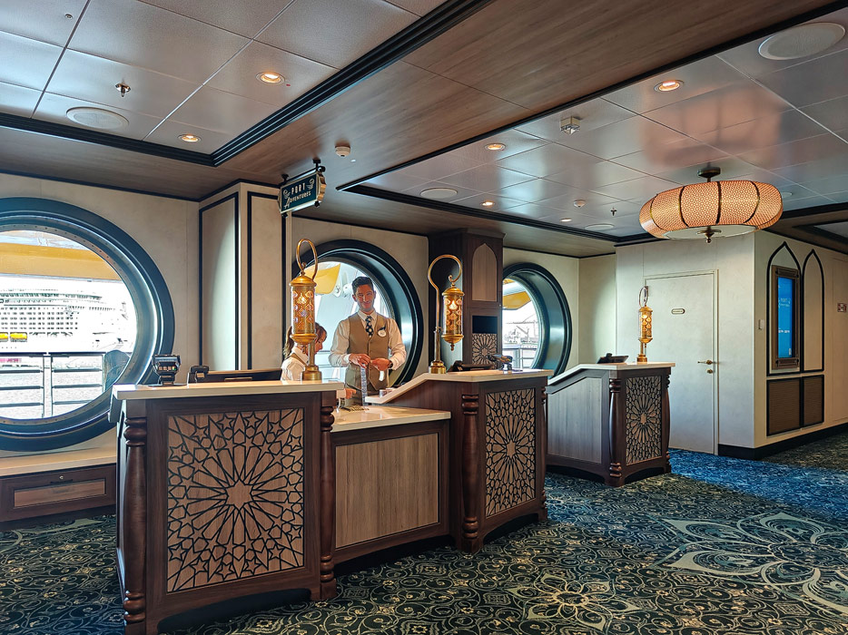 Bilder weiterer Bereiche der Disney Treasure: Treppenhaus, Aufzüge, Orientierung, Kunstwerke, Shops, Guest Services, Disney-Charaktere