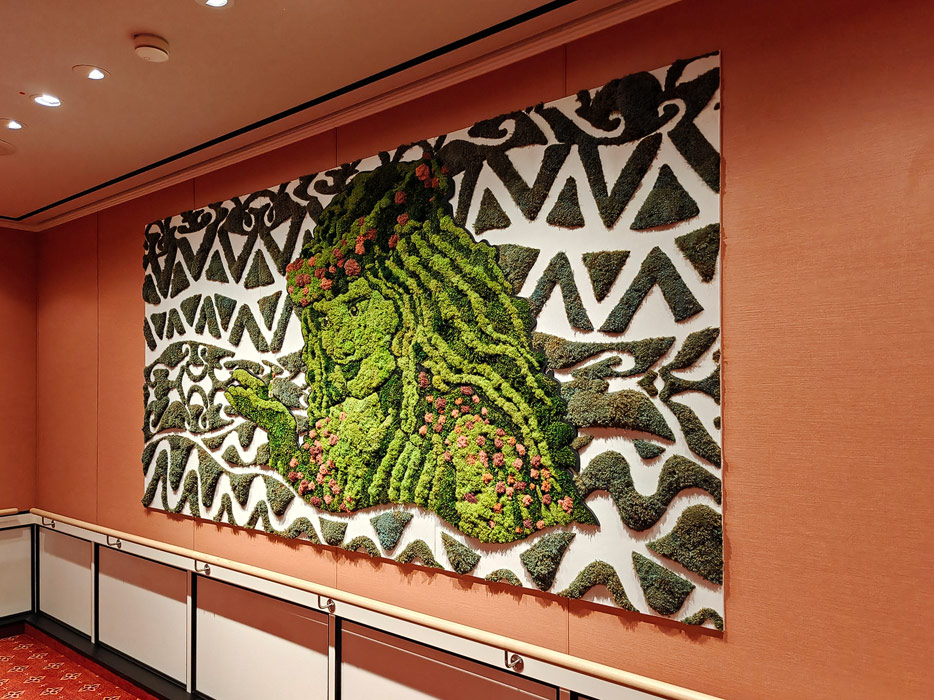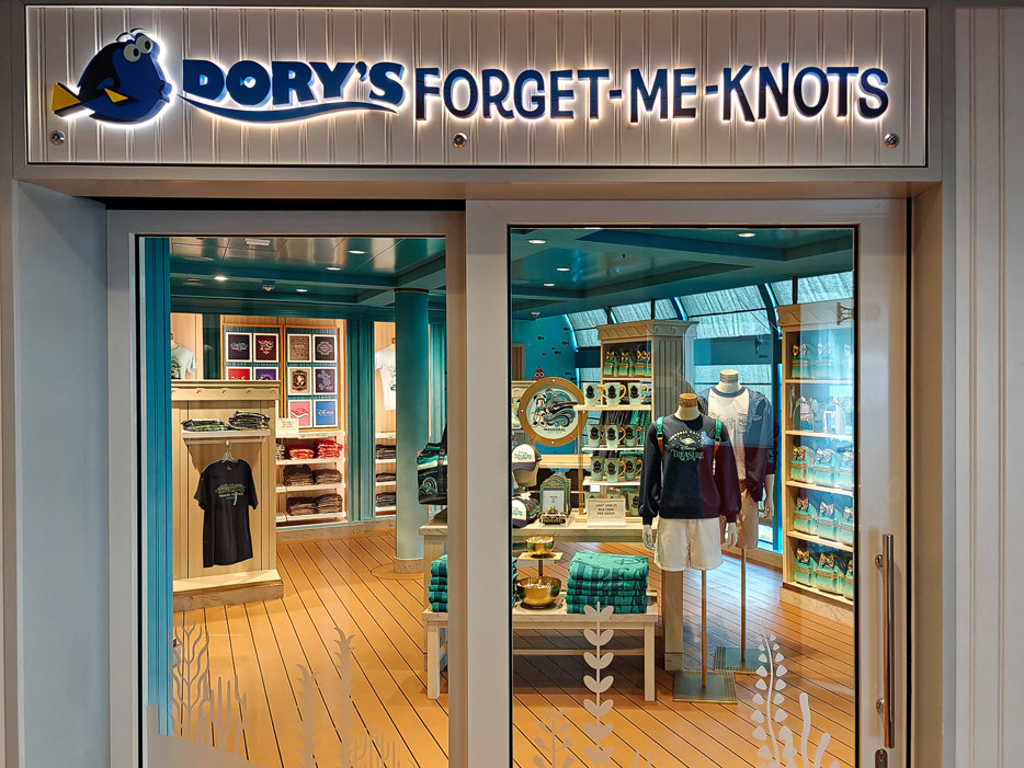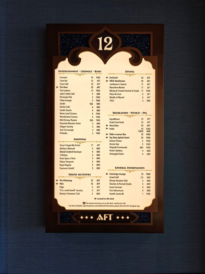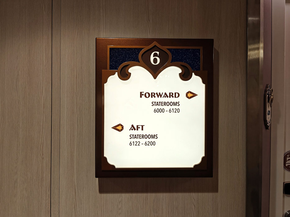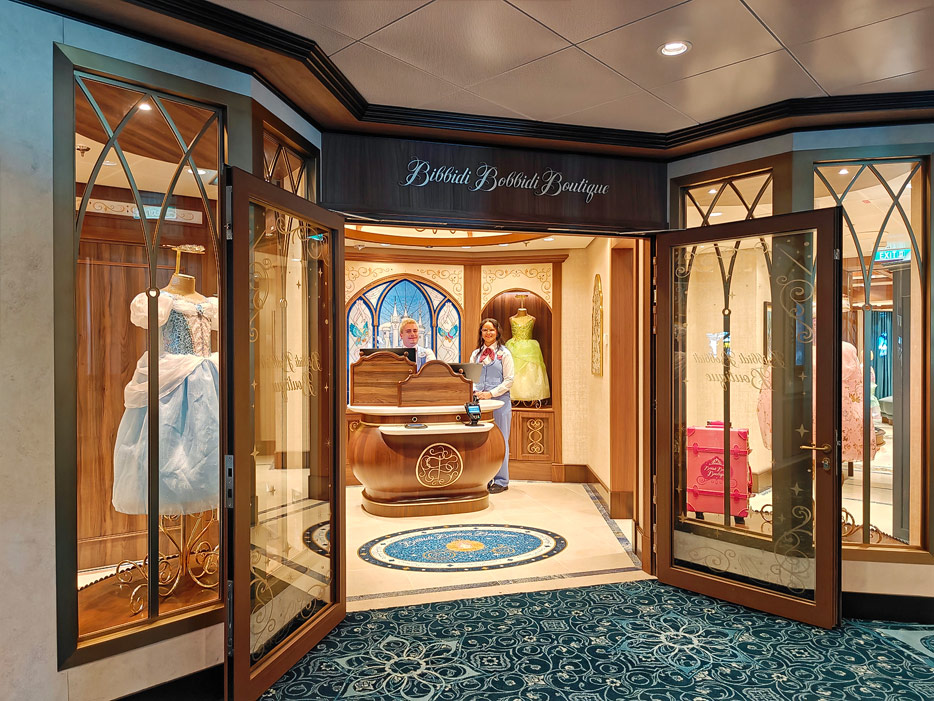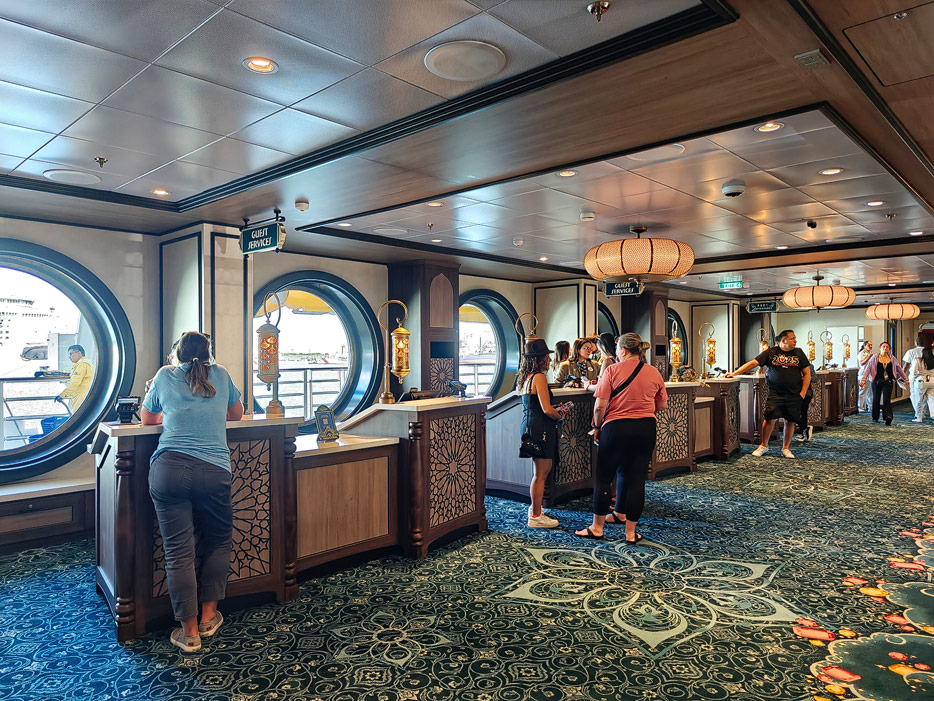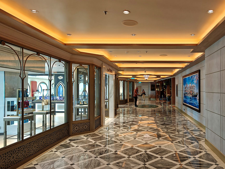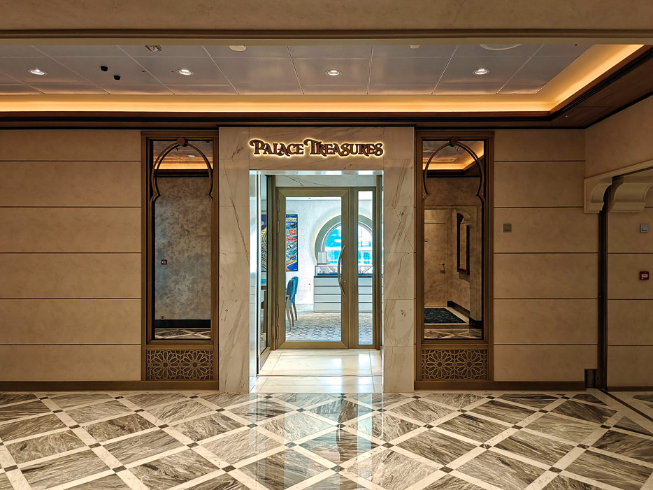 Bilder weiterer Bereiche der Disney Treasure: Treppenhaus, Aufzüge, Orientierung, Kunstwerke, Shops, Guest Services, Disney-Charaktere