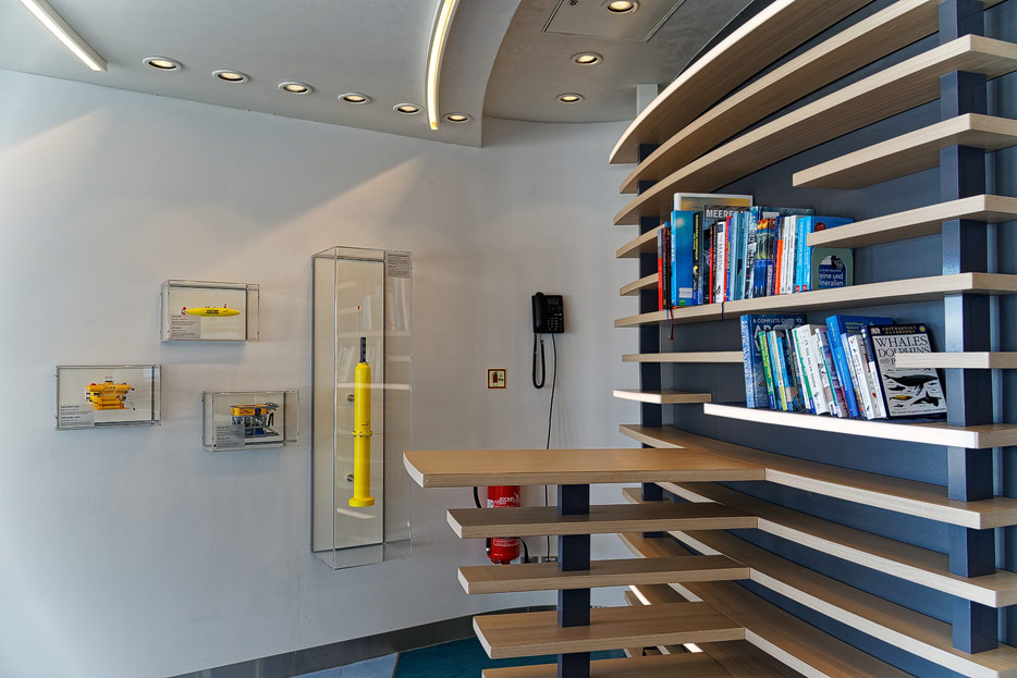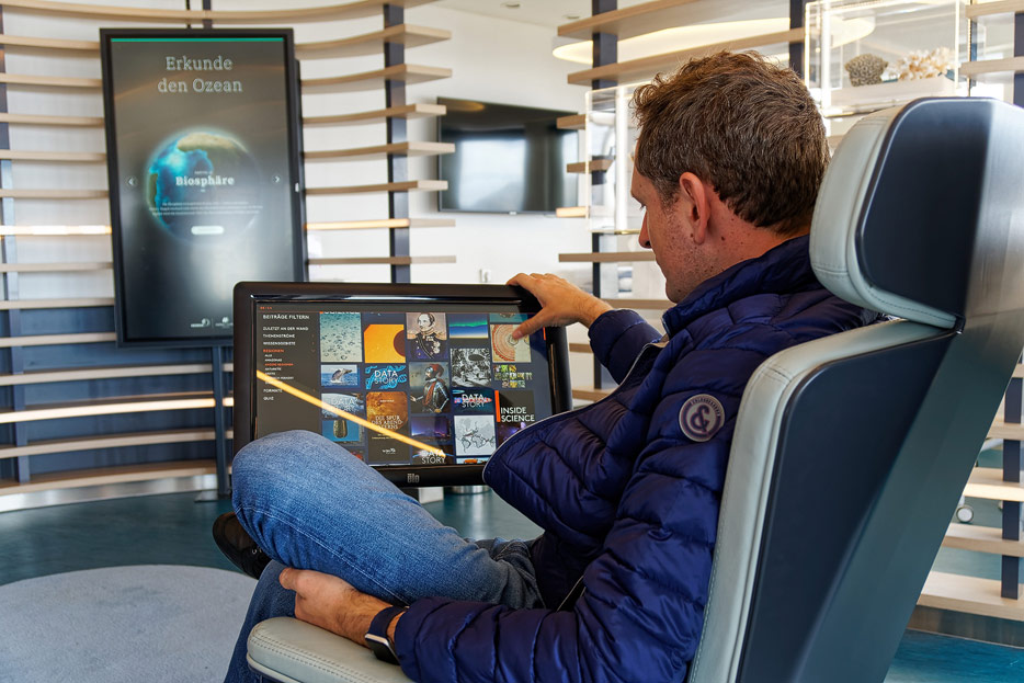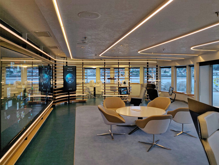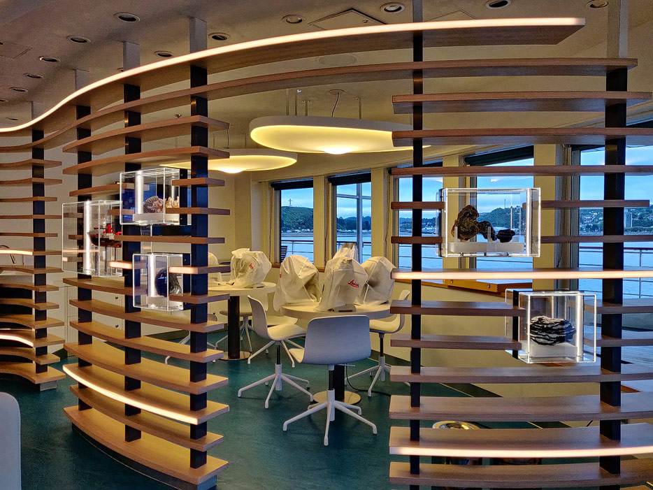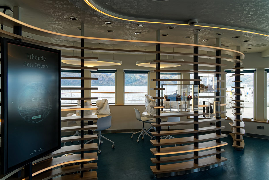 Bilder der Ocean Academy der Hanseatic Nature: interaktiver Fortbildungsraum, Mikroskope, kleines Museum