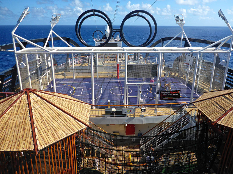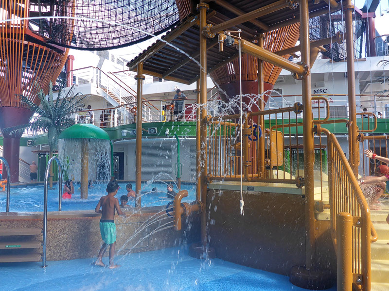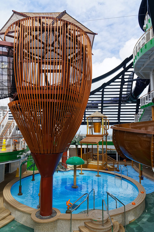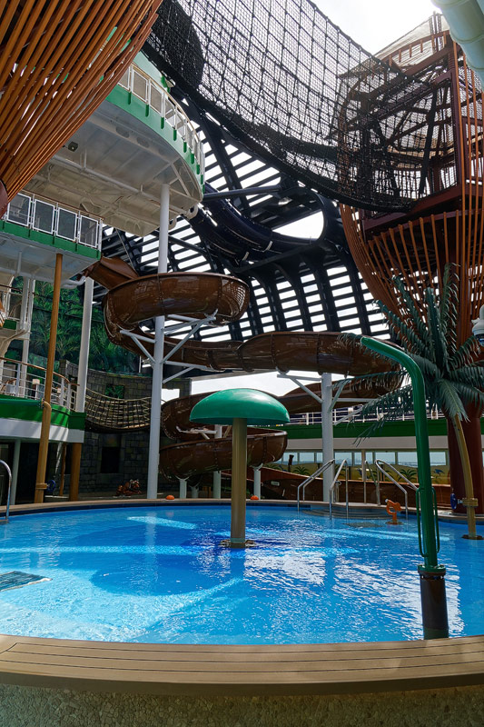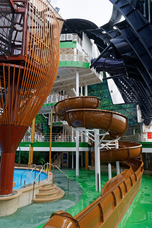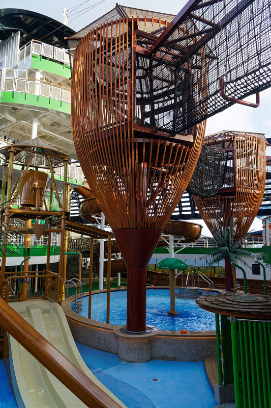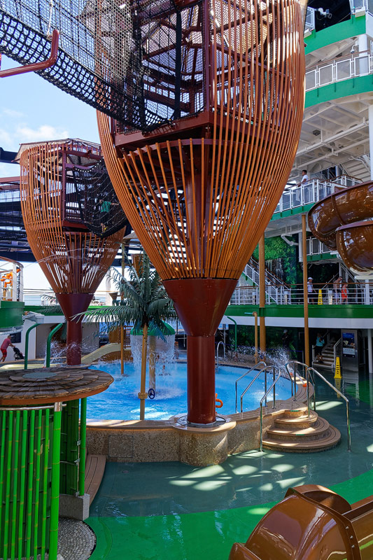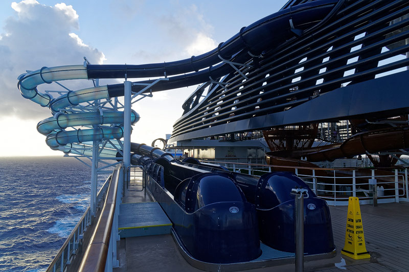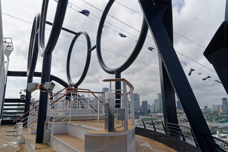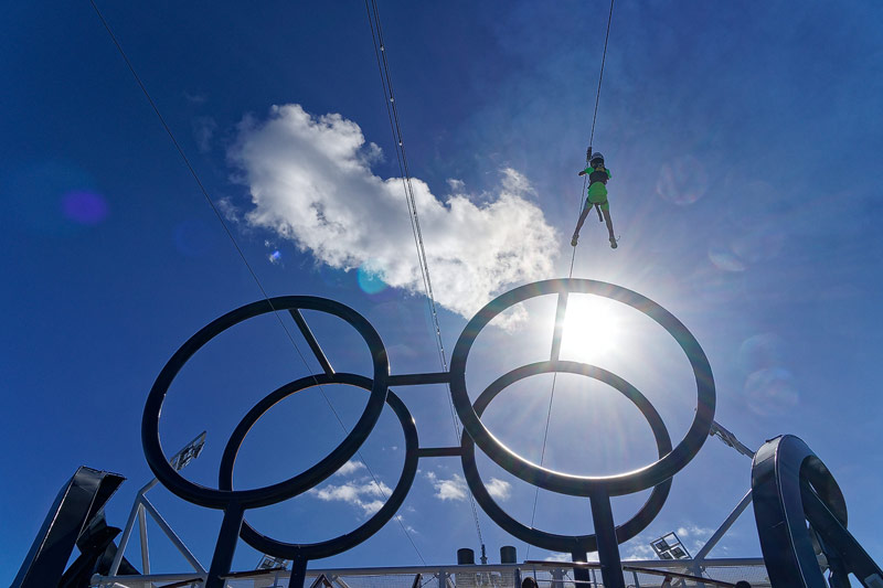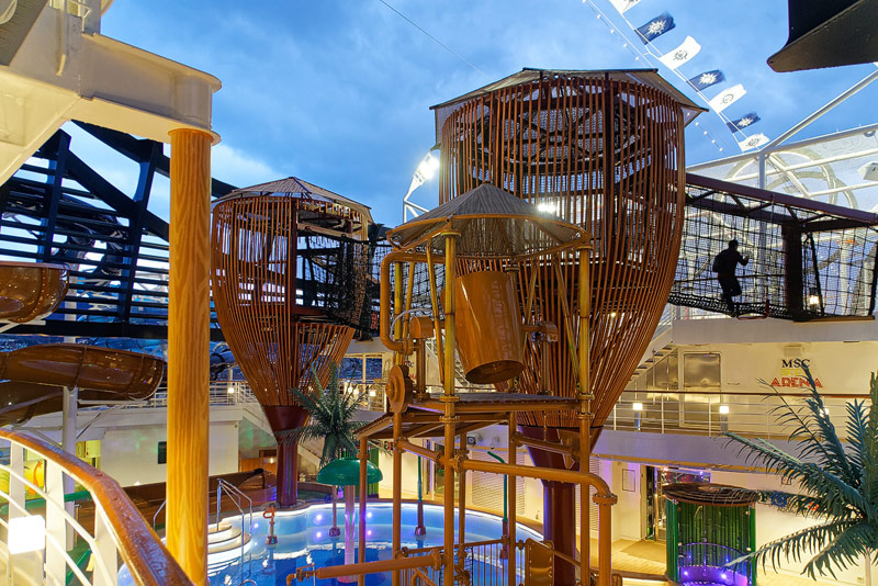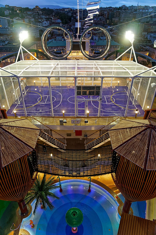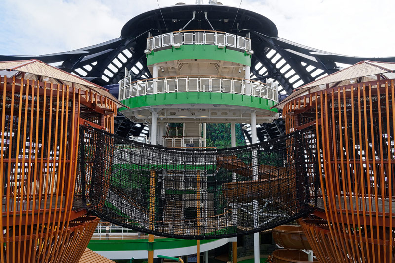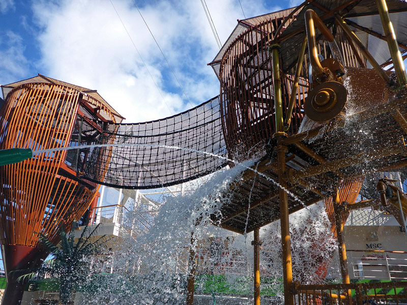 Aussendecks der MSC Seaside: Forest Aquaventure Park, Promenade, Pools, Sorts Arena, Zip-Line, Top 19 Sundeck