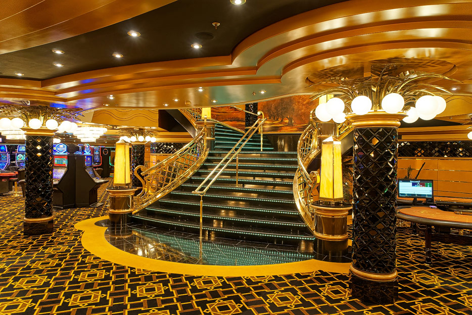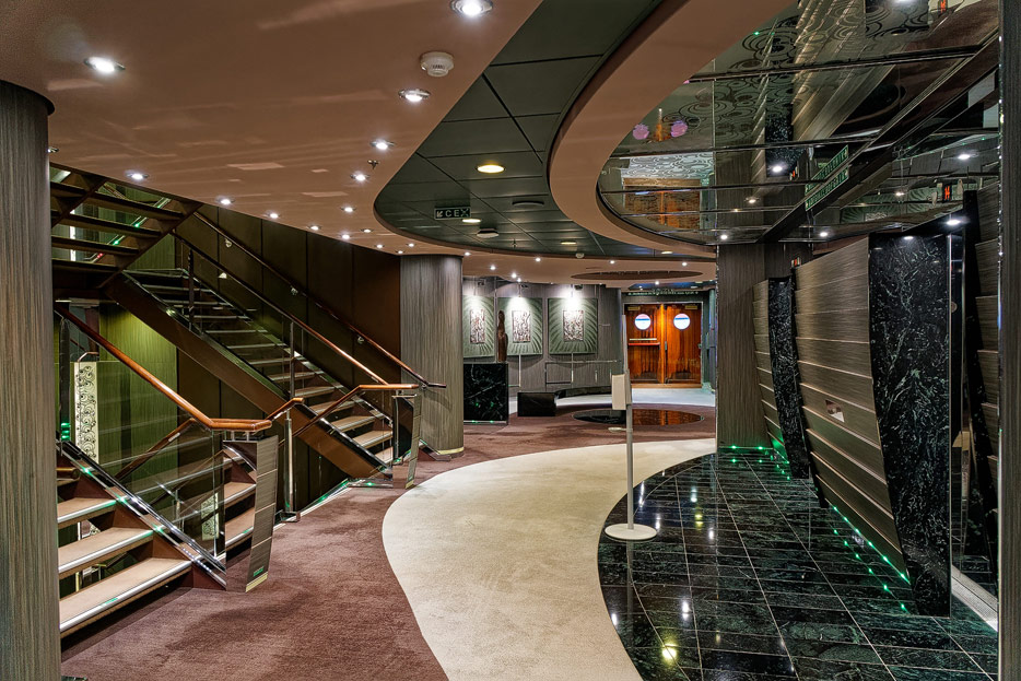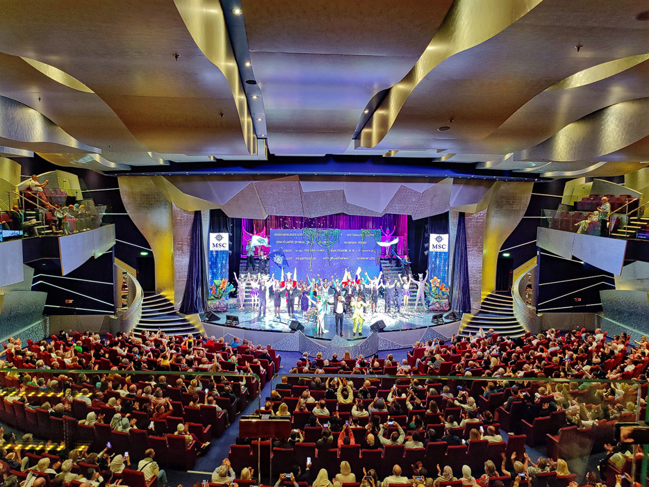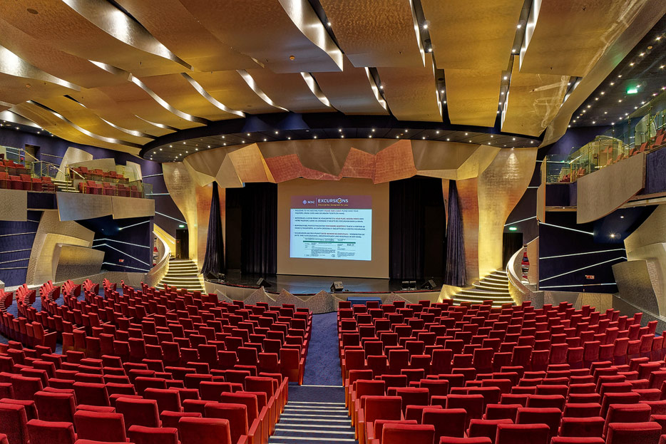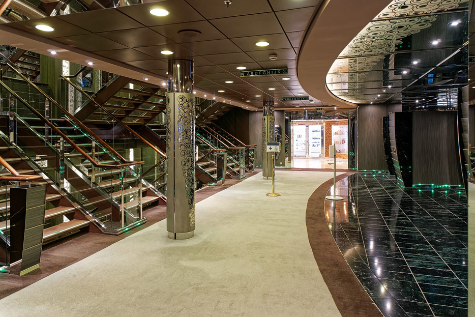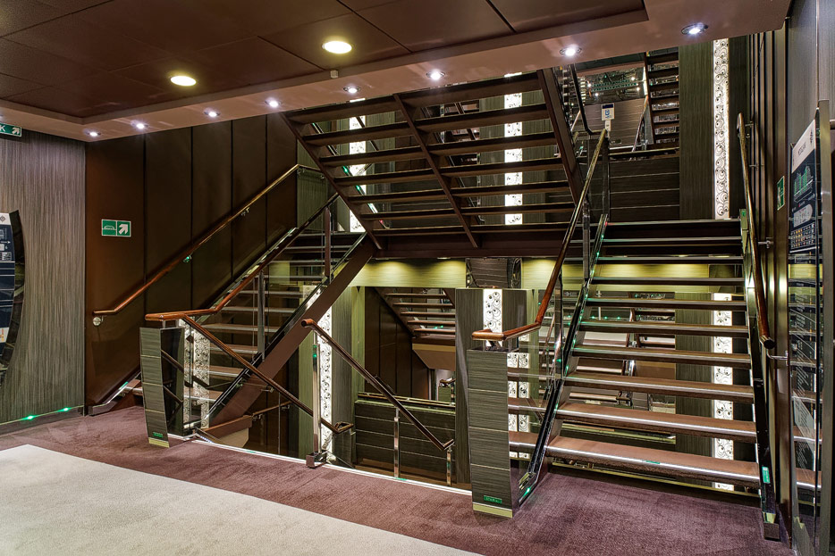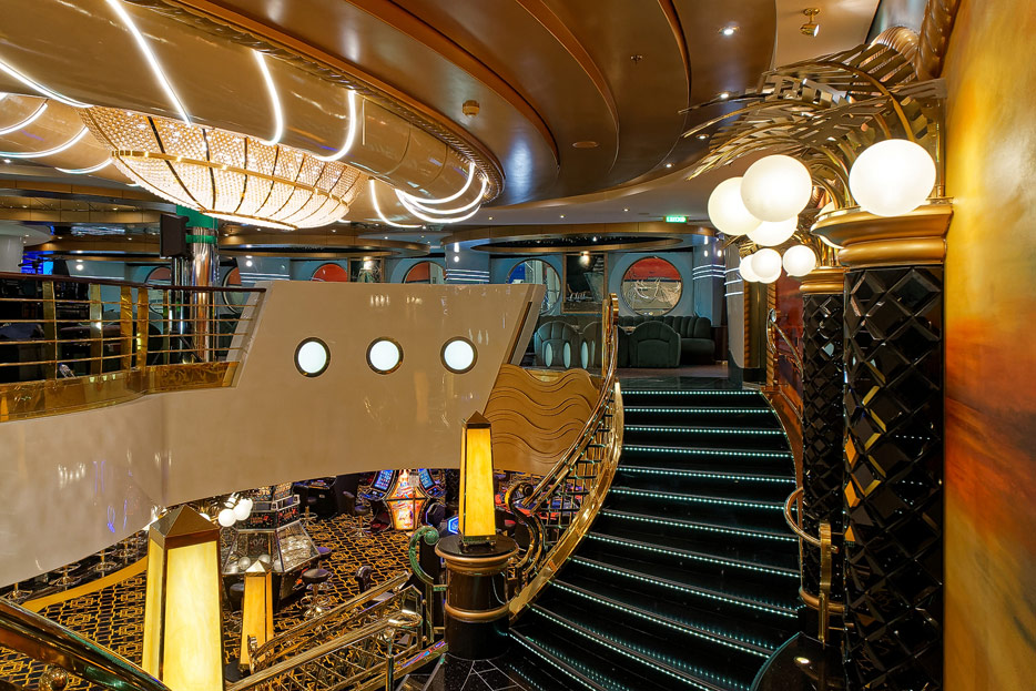 BIlder weiterer Bereiche der MSC Splendida, u.a. Casino, Theater, Bibliothek, Treppenhäuser