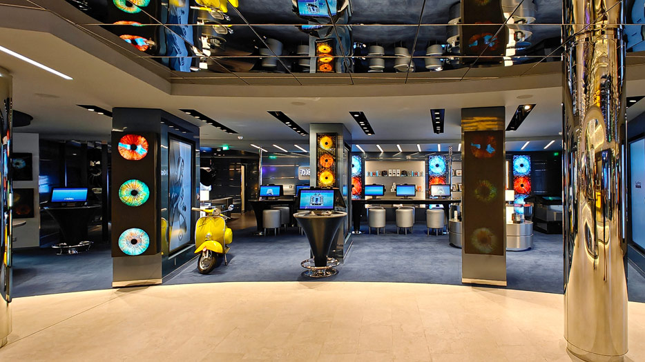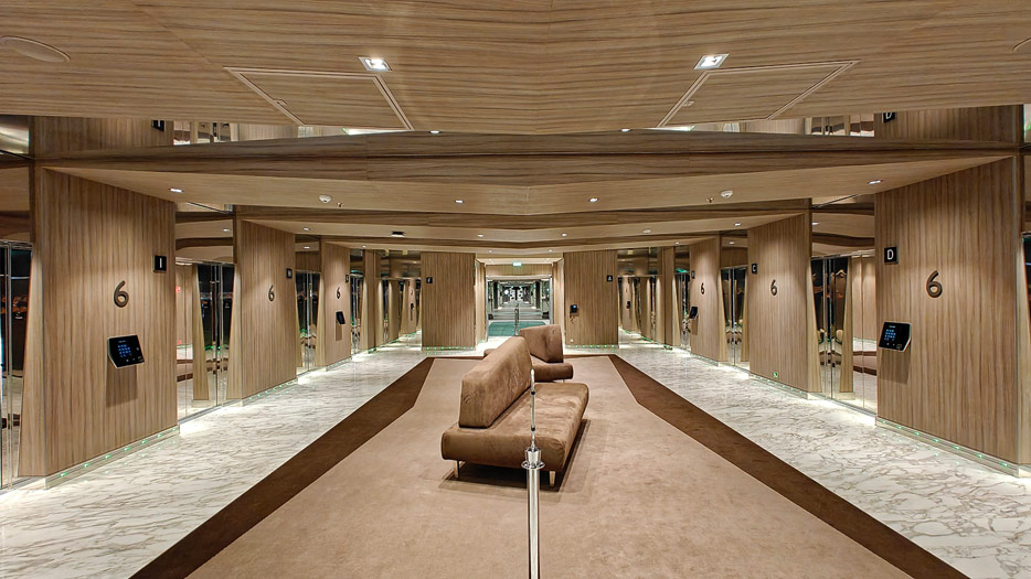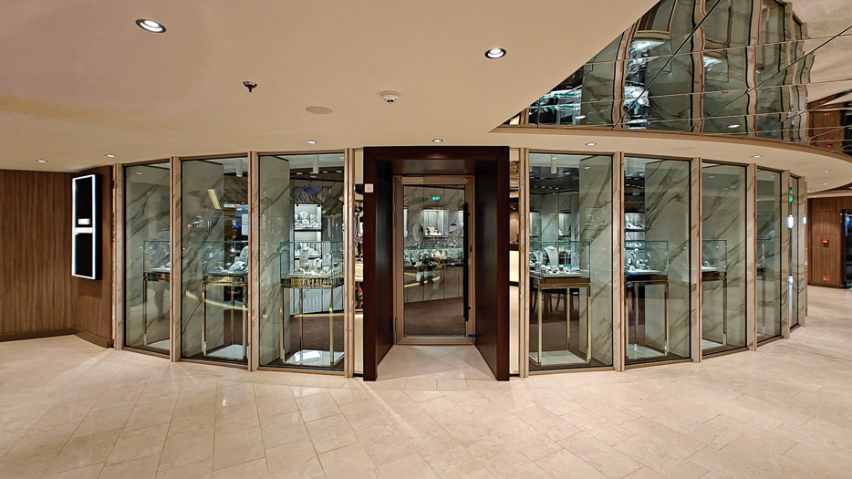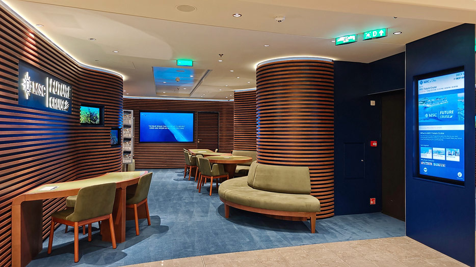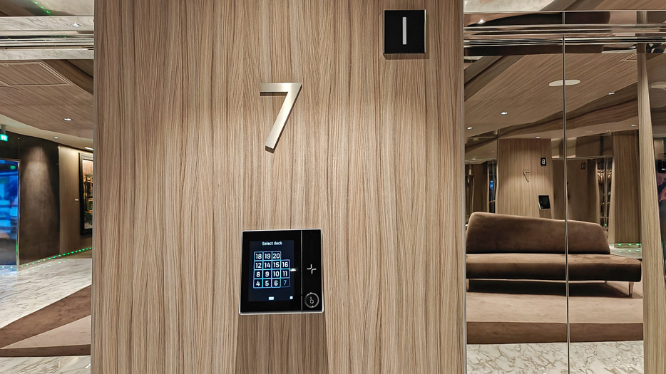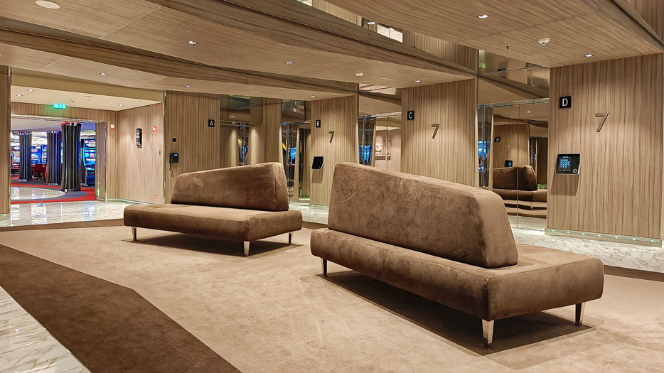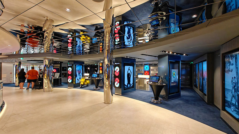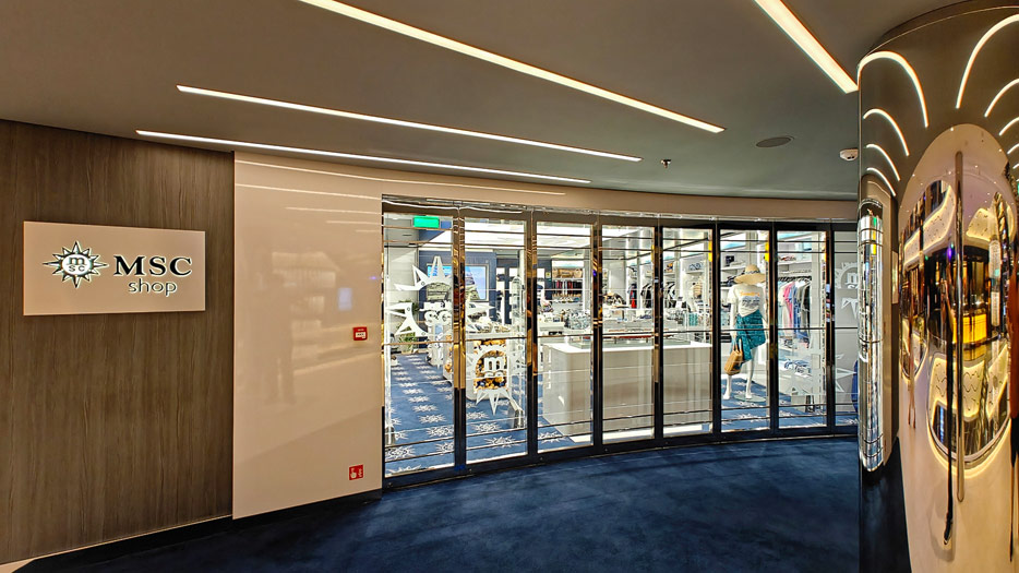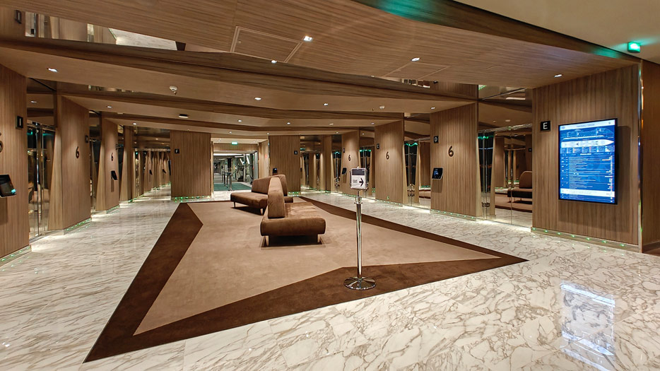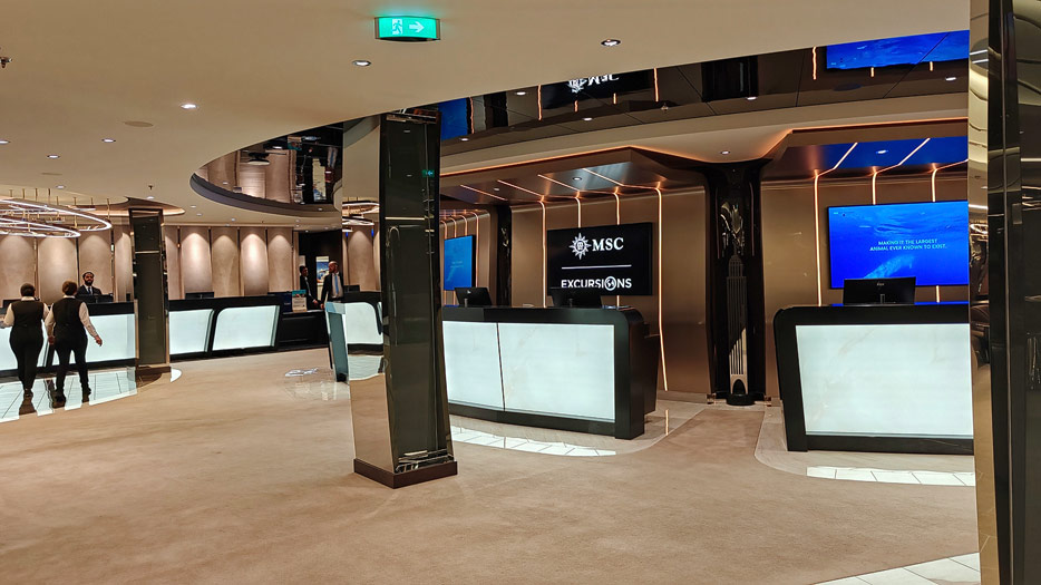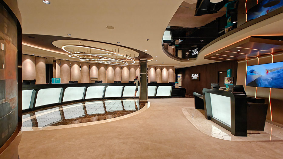 BIlder weiterer Bereiche auf der MSC World America: Aufzuege, Shops, Rezeption