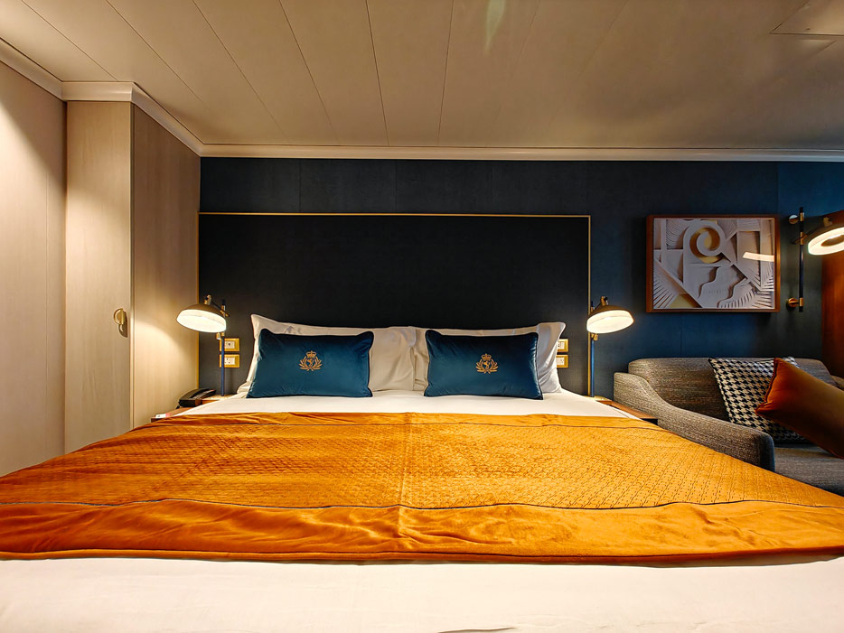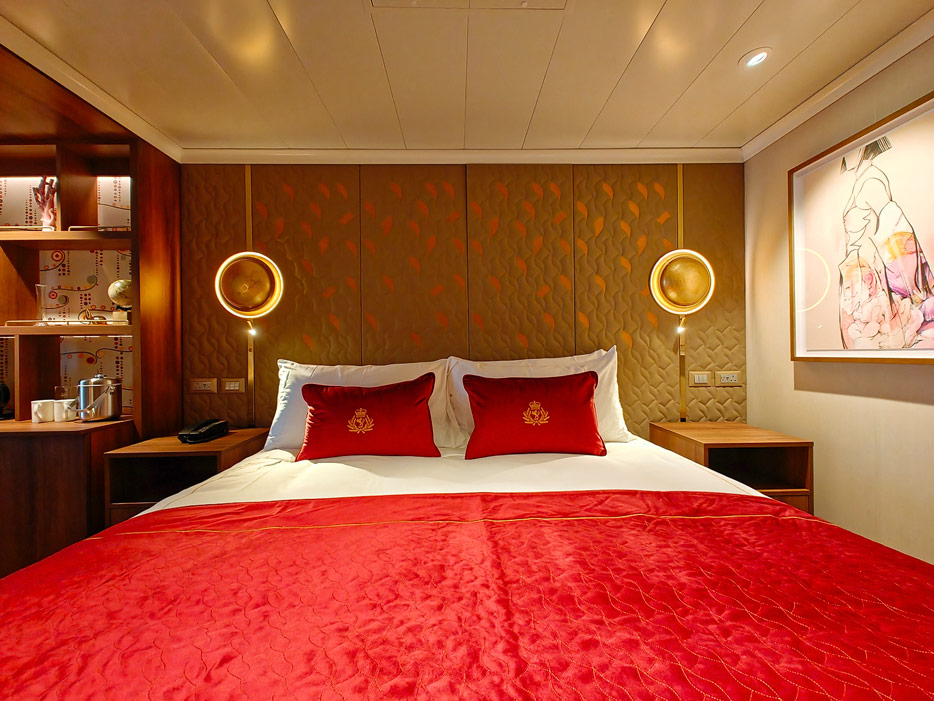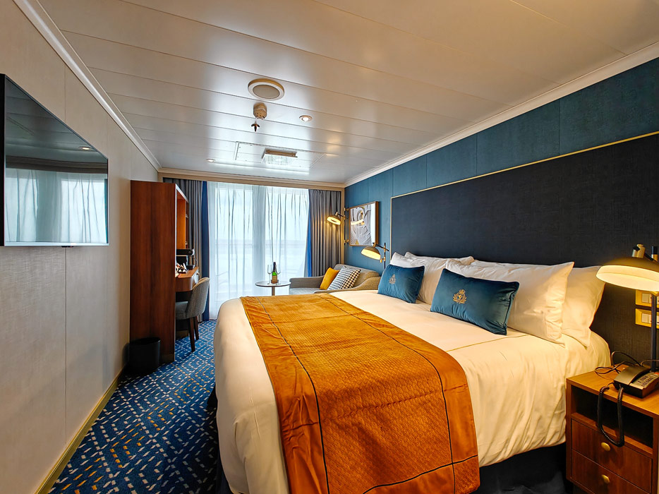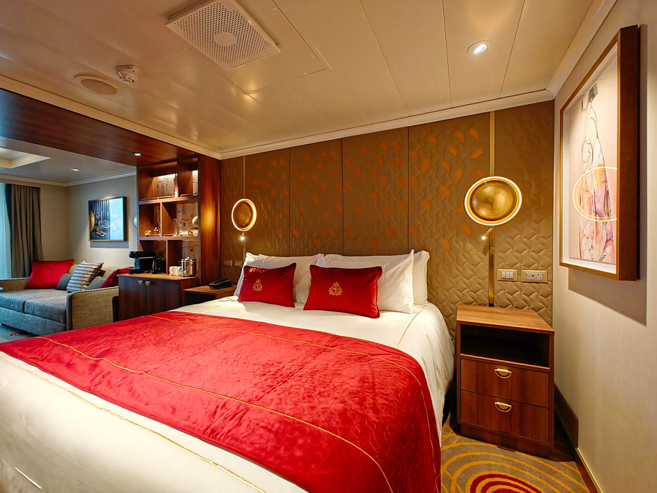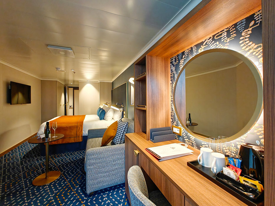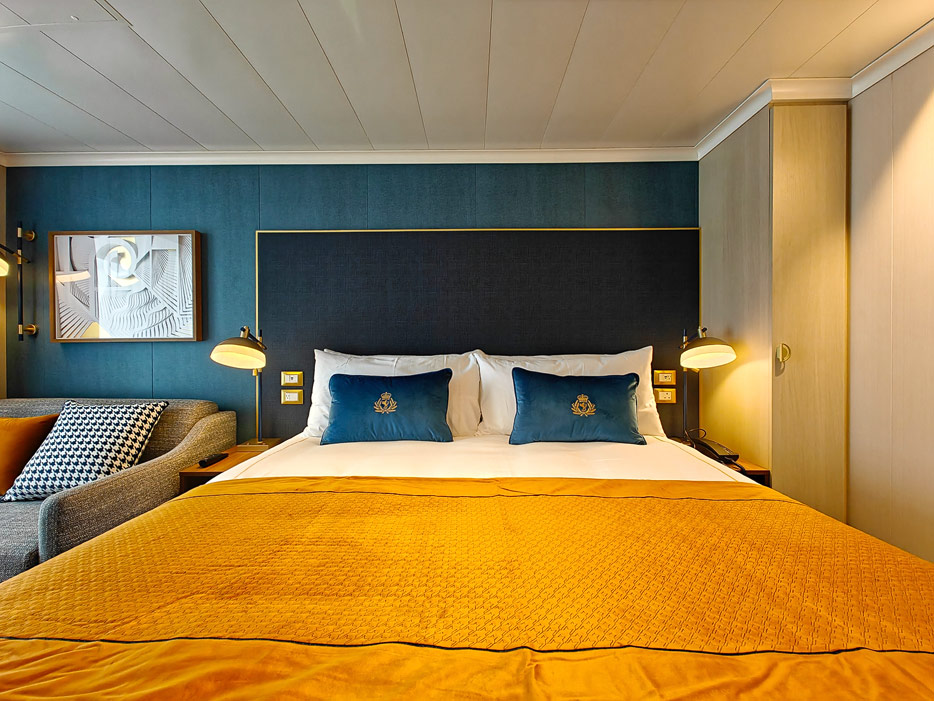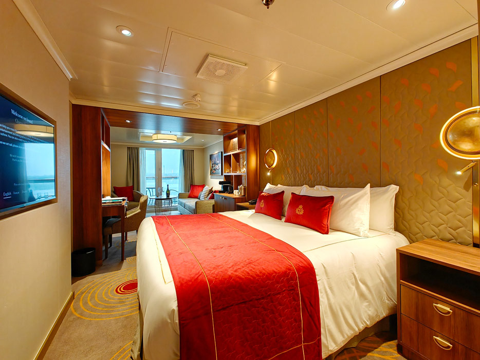 Bilder der vier wesentlichen Kabinenkategorien der Queen Anne von Cunard Line: Britannia, Britannia Club, Princess Grill Suiten und Queens Grill Suiten