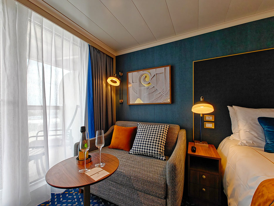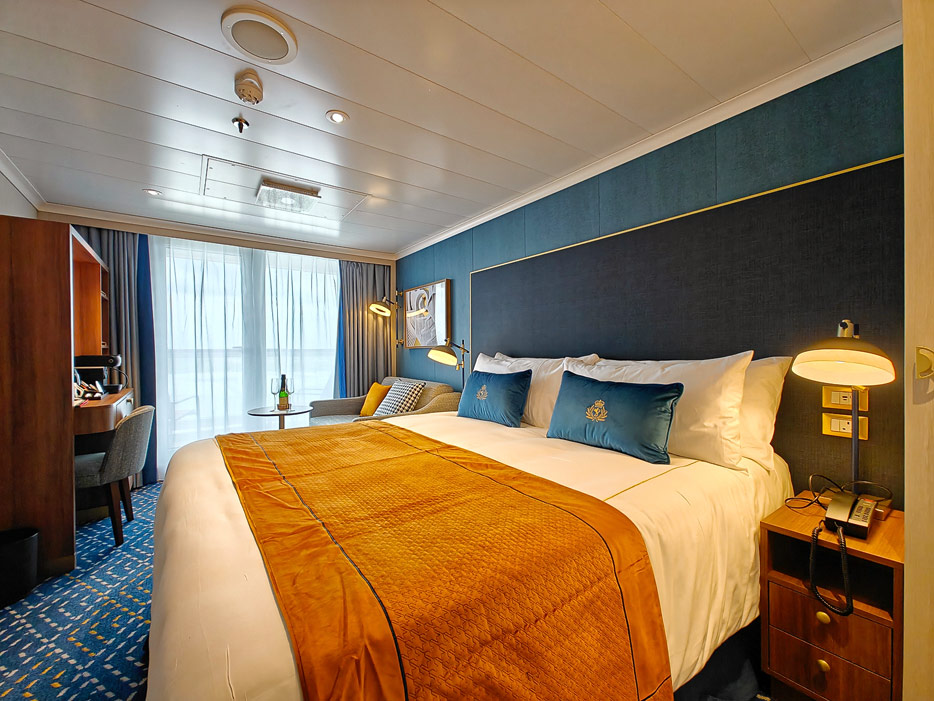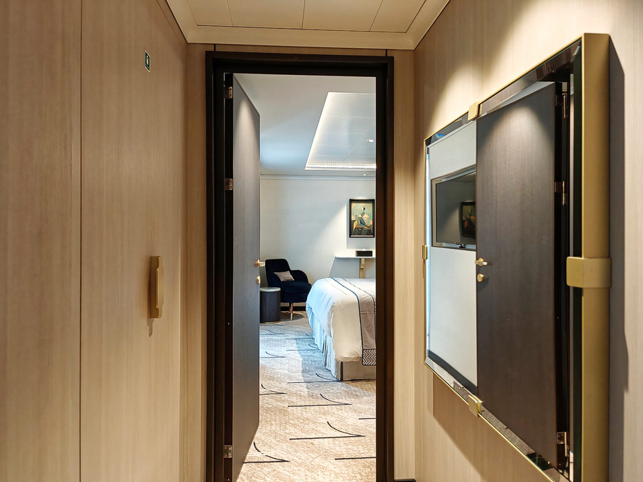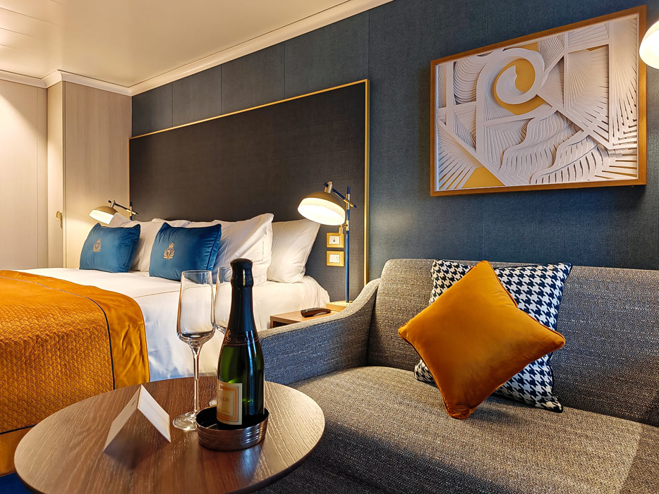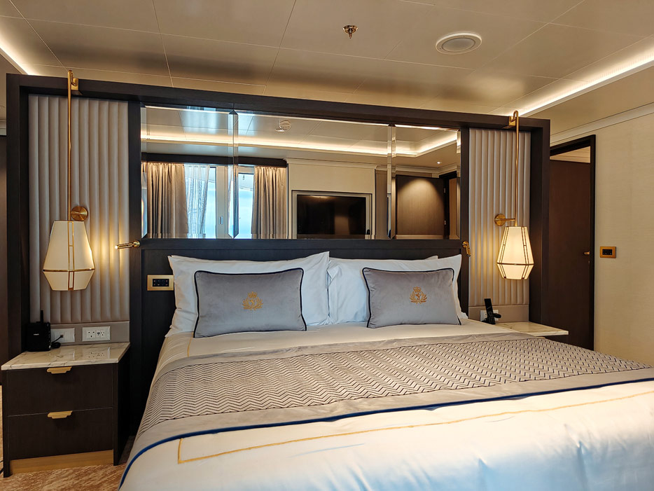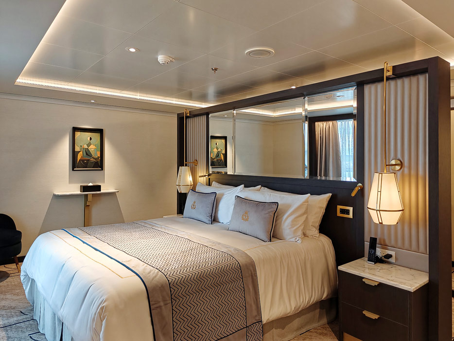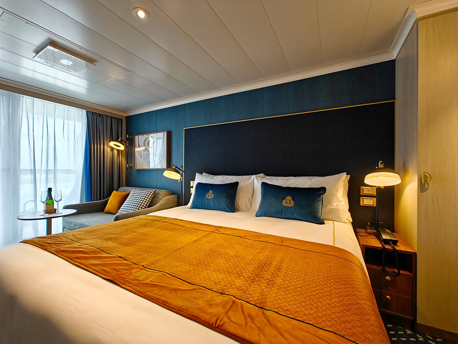 Bilder der vier wesentlichen Kabinenkategorien der Queen Anne von Cunard Line: Britannia, Britannia Club, Princess Grill Suiten und Queens Grill Suiten