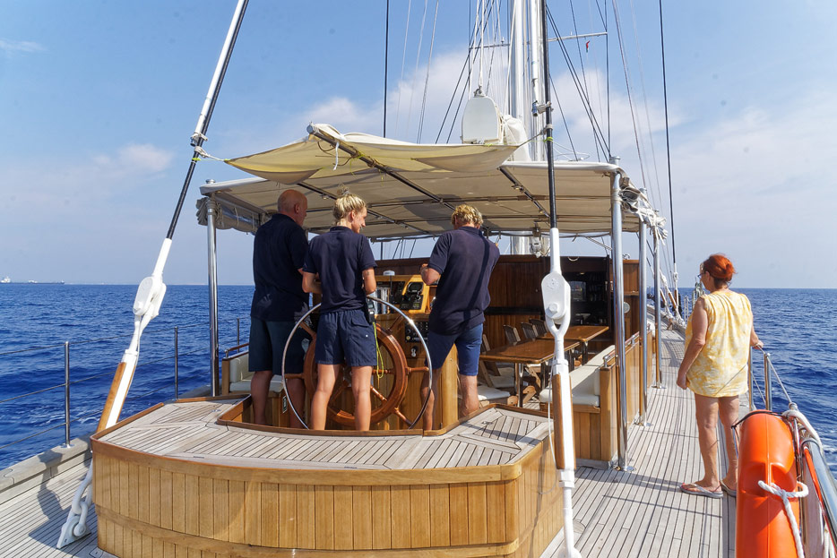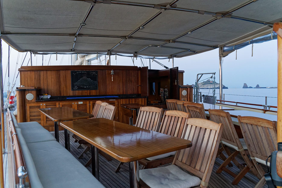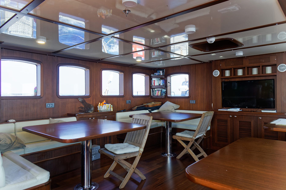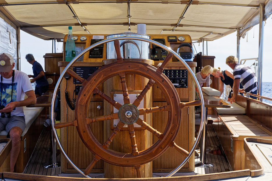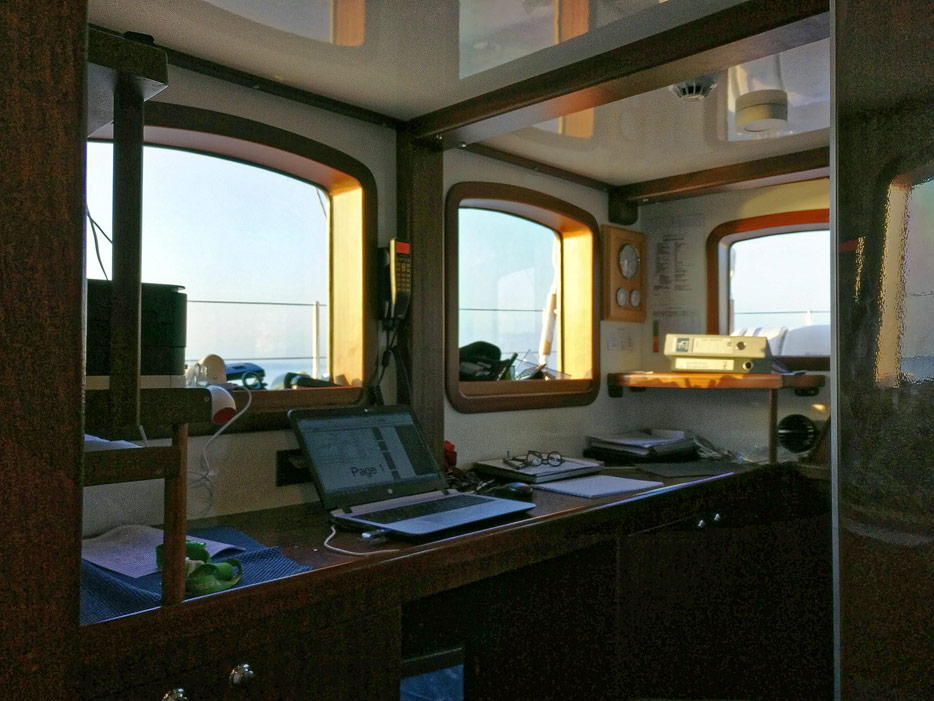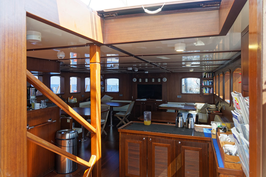 Bilder vom Hauptdeck der Rhea mit Vordeck, mittschiffs und Deckshaus, Salon, Bar, Kapitänsbüro und Steuerstand