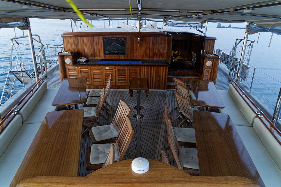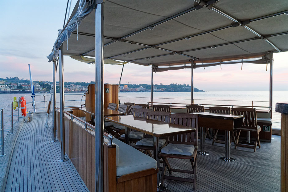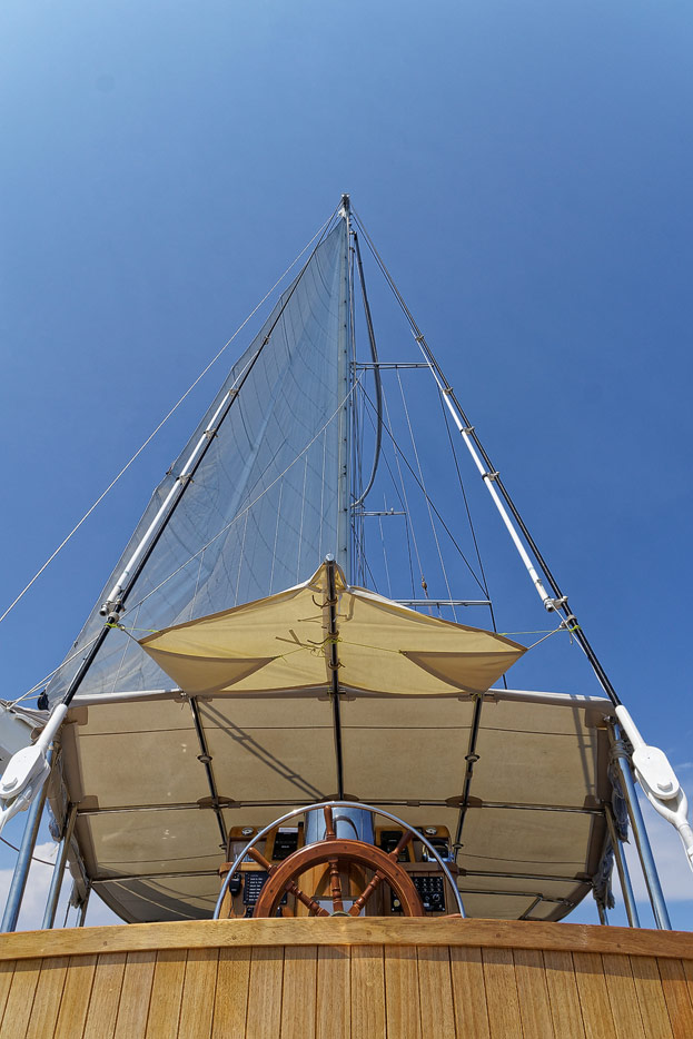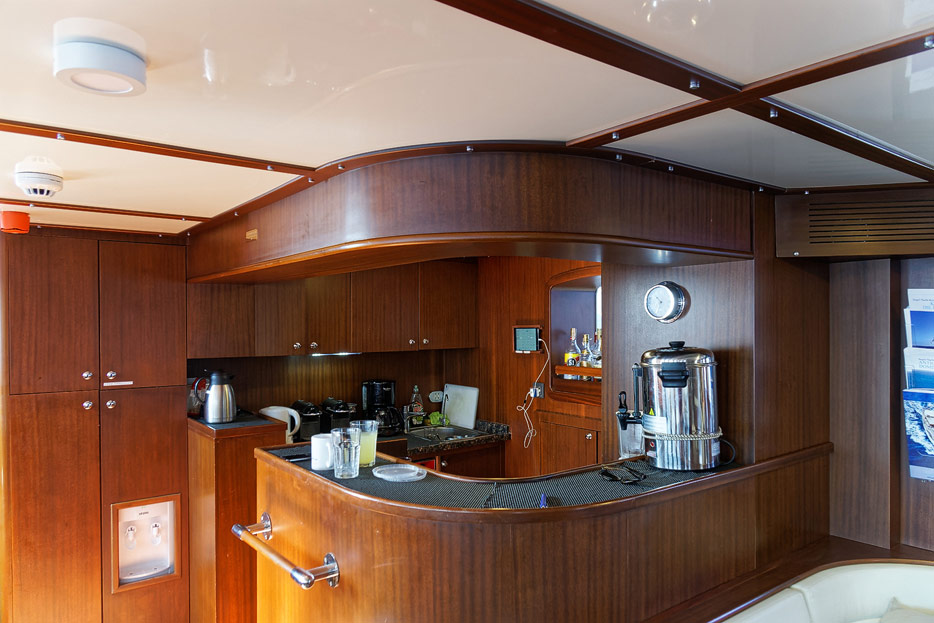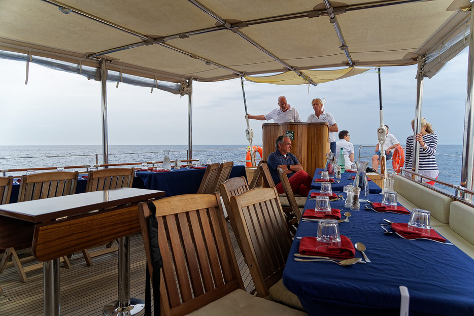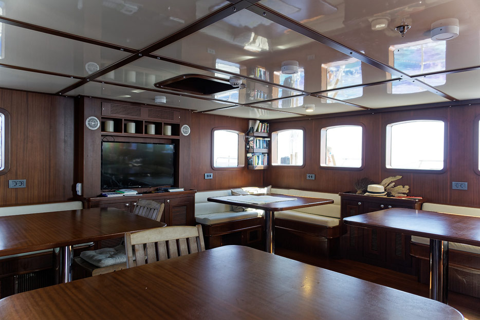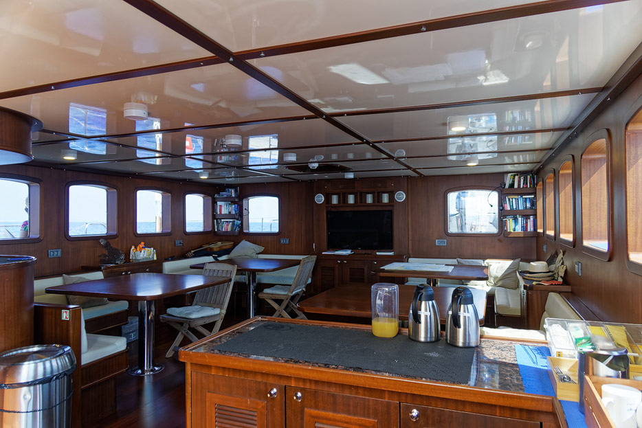 Bilder vom Hauptdeck der Rhea mit Vordeck, mittschiffs und Deckshaus, Salon, Bar, Kapitänsbüro und Steuerstand