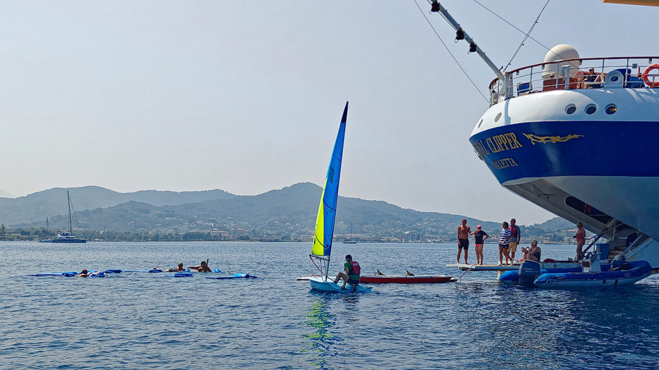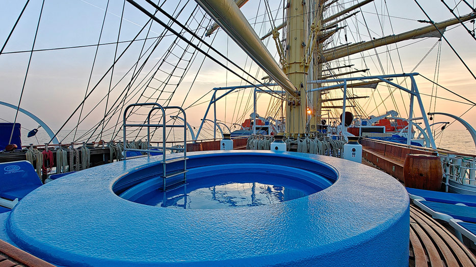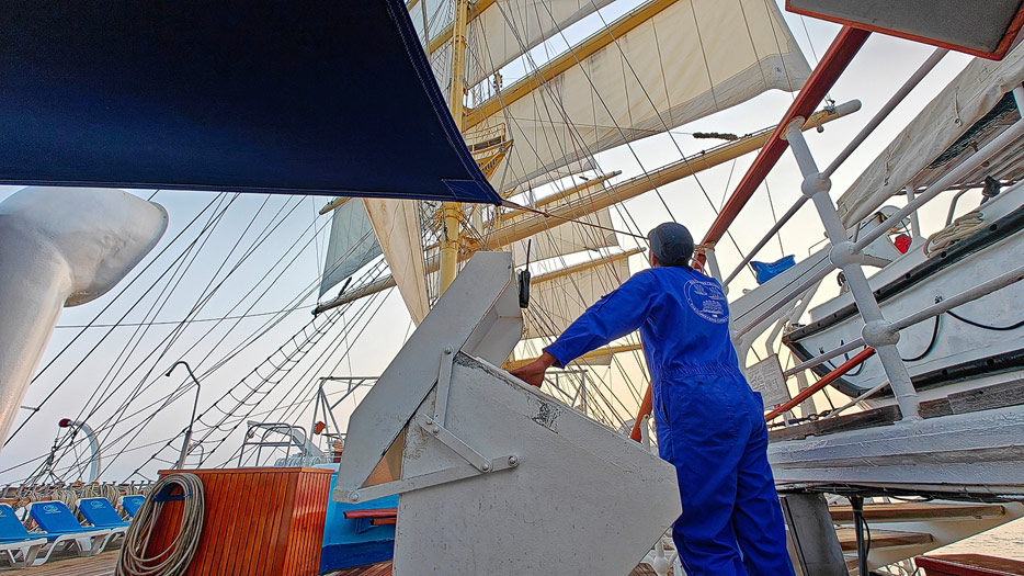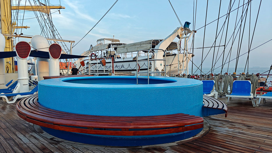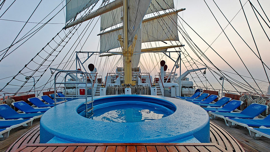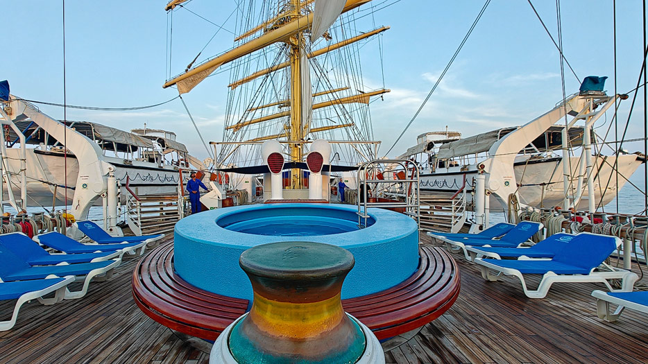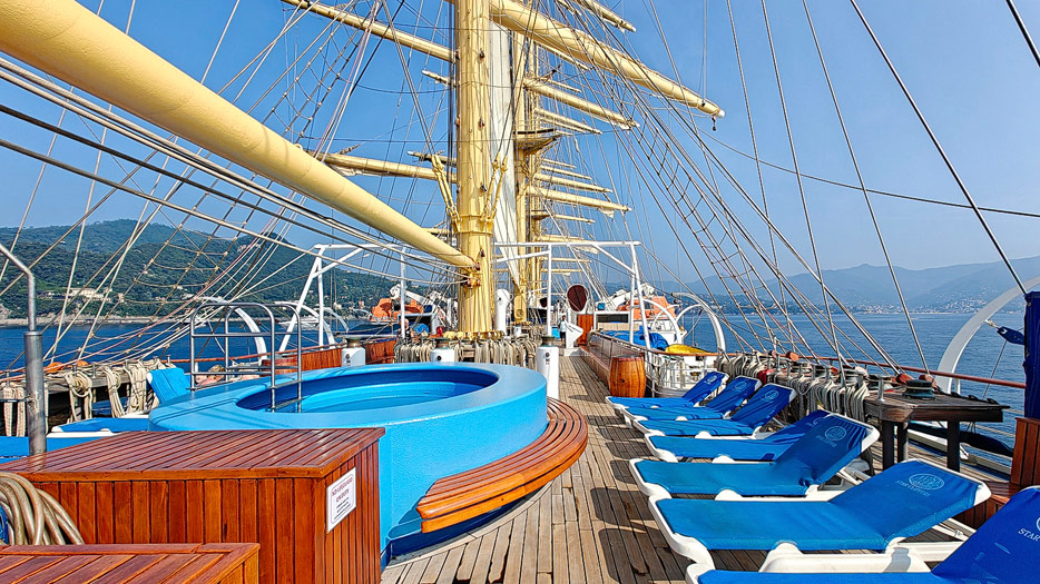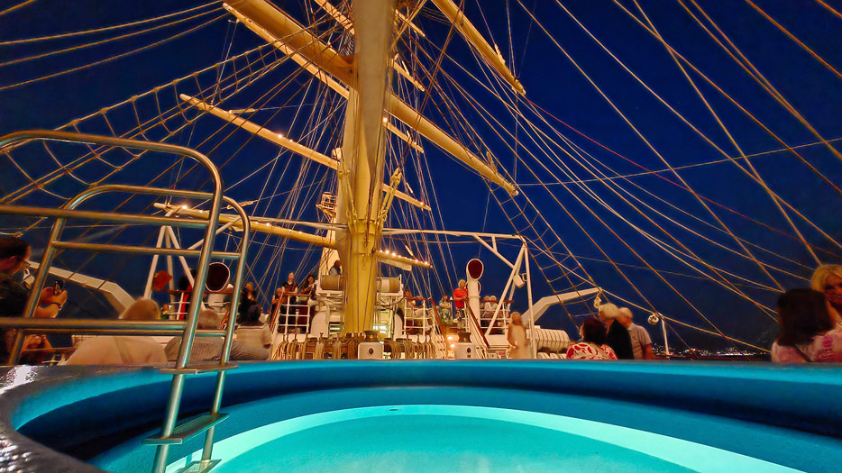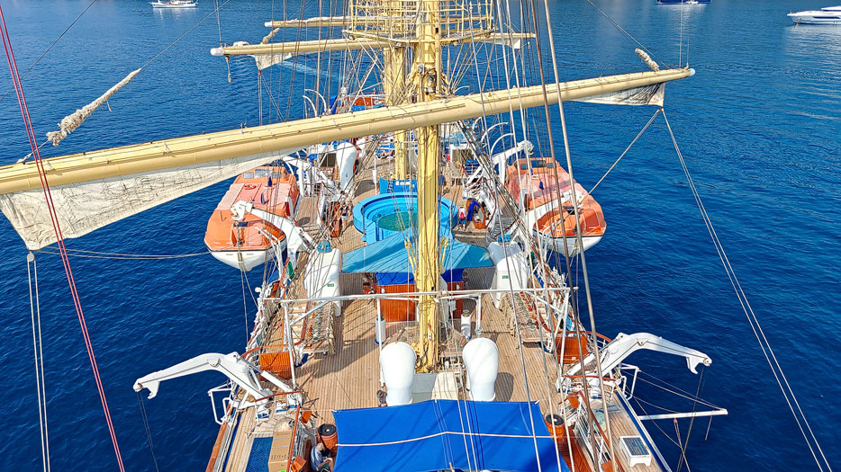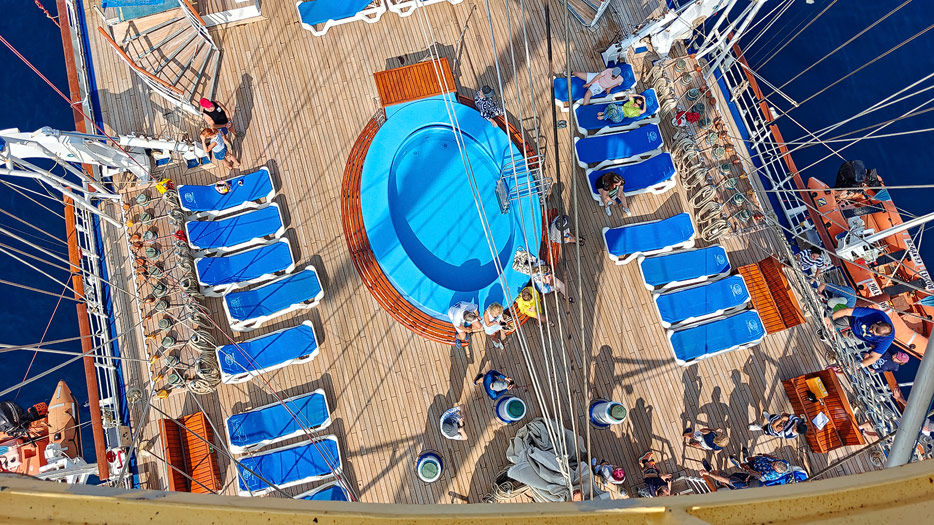 Bilder von den Aussendecks der Royal Clipper inklusive Pools, Marina, Brücke und Bugspriet-Netz