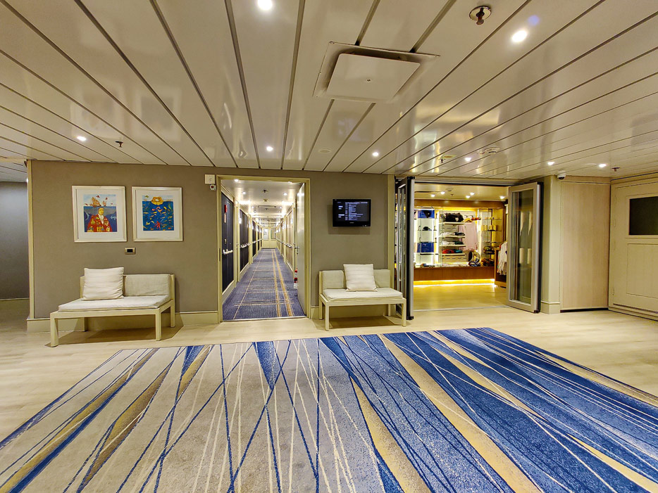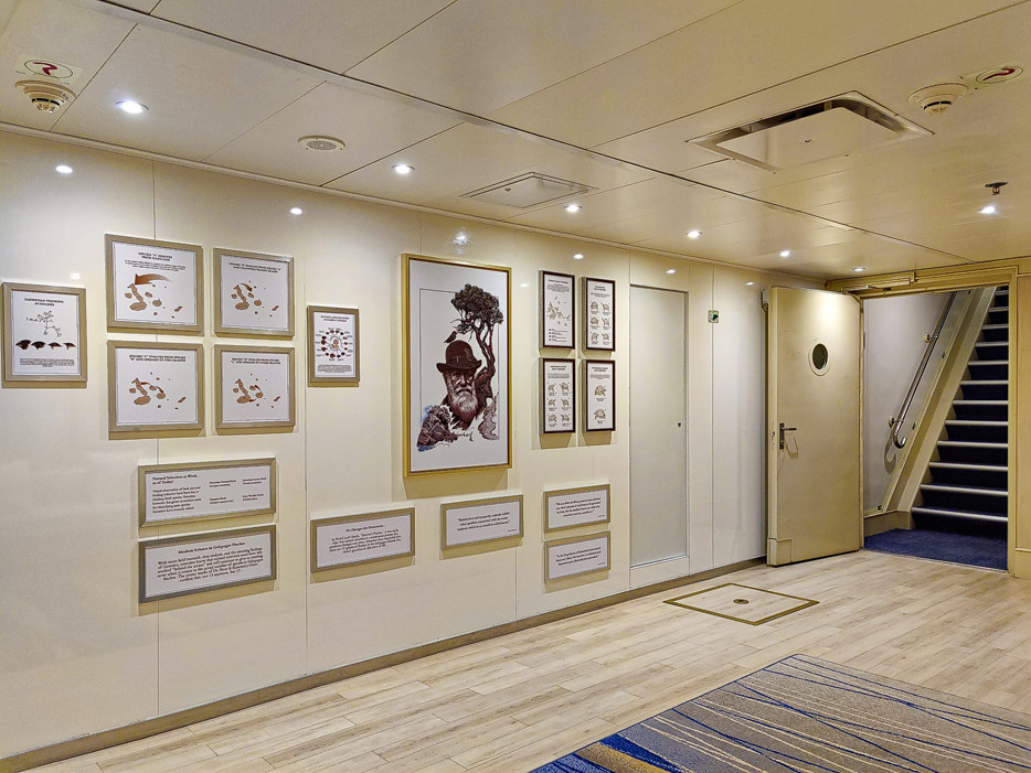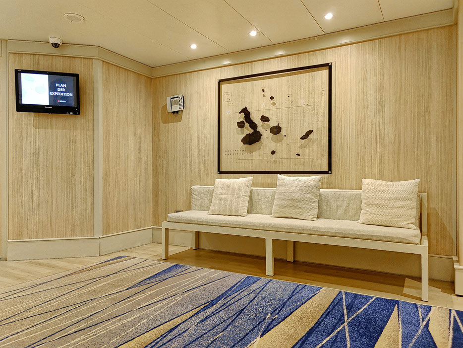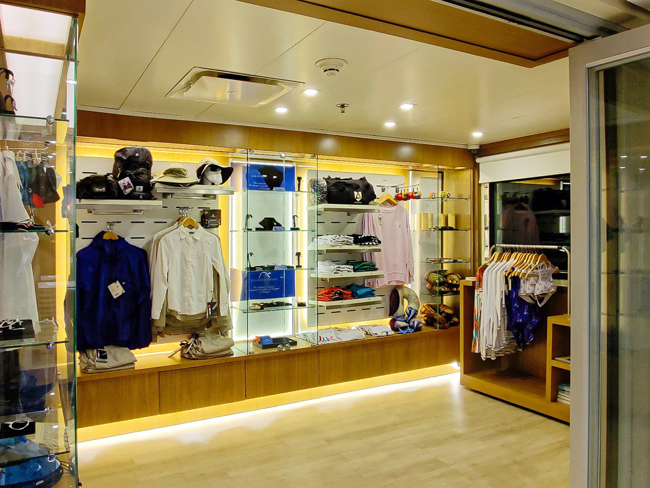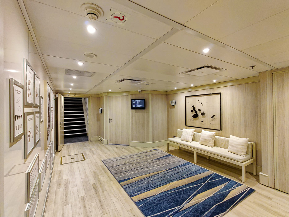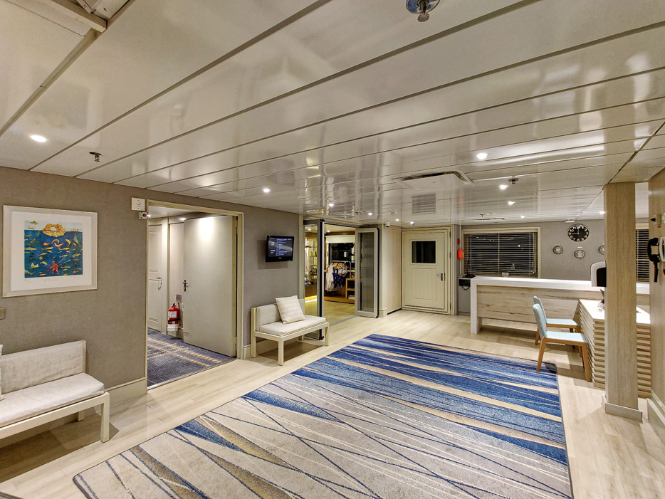 Bilder weiterer Bereiche der Santa Cruz II von Hurtigruten: Rezeption, Treppenhaus, Shop, Discovery Room