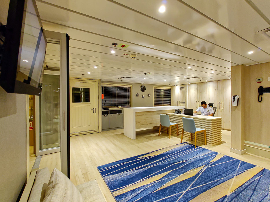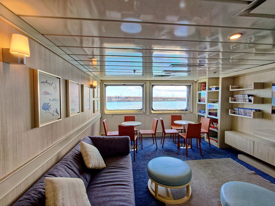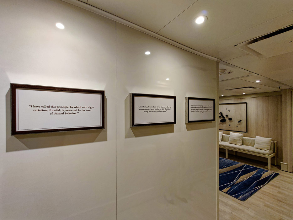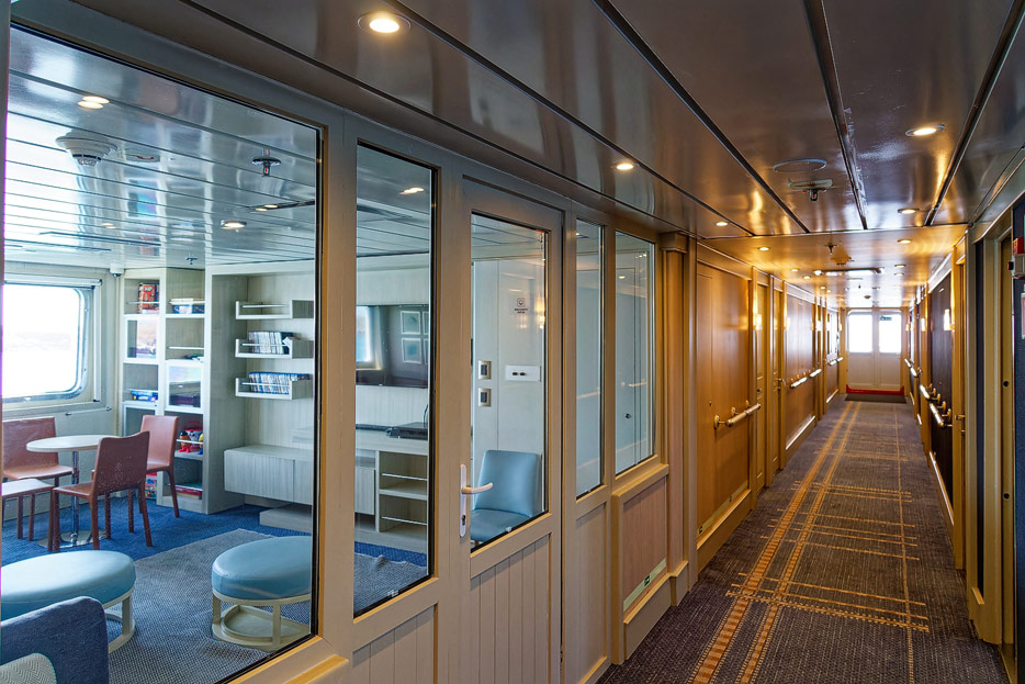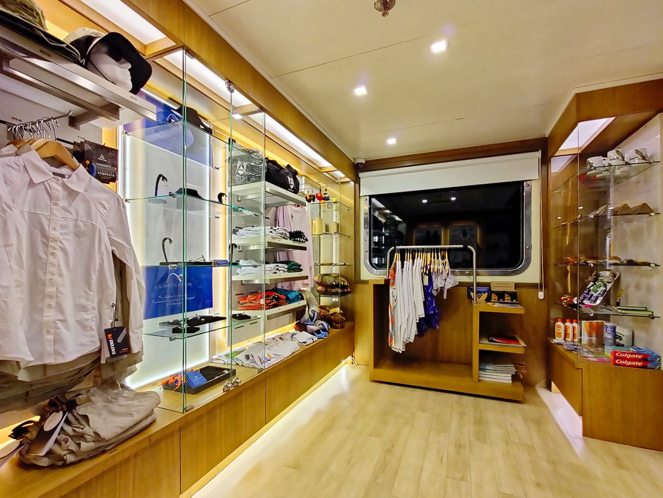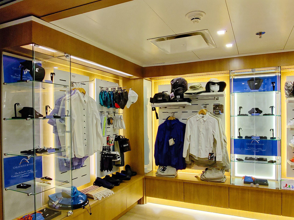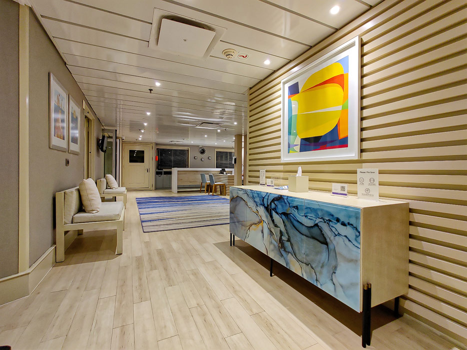 Bilder weiterer Bereiche der Santa Cruz II von Hurtigruten: Rezeption, Treppenhaus, Shop, Discovery Room