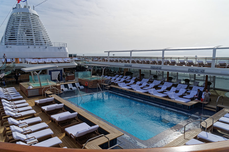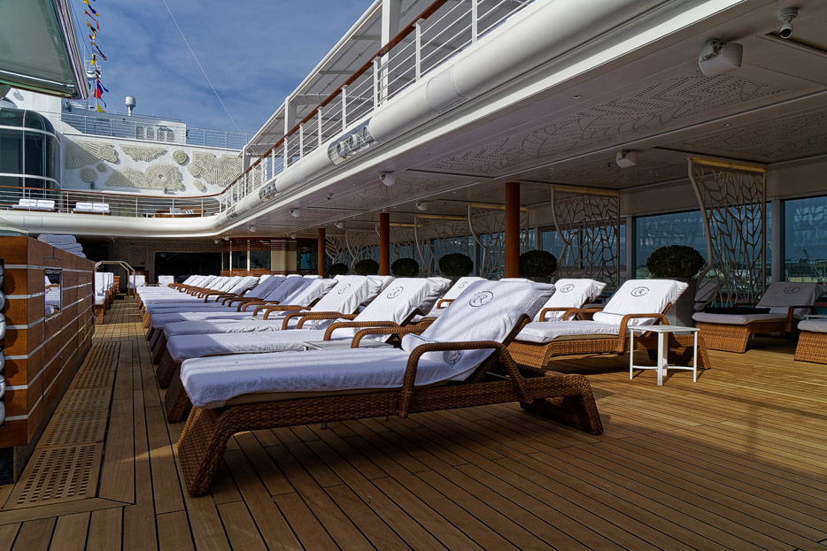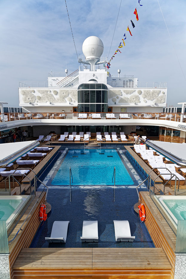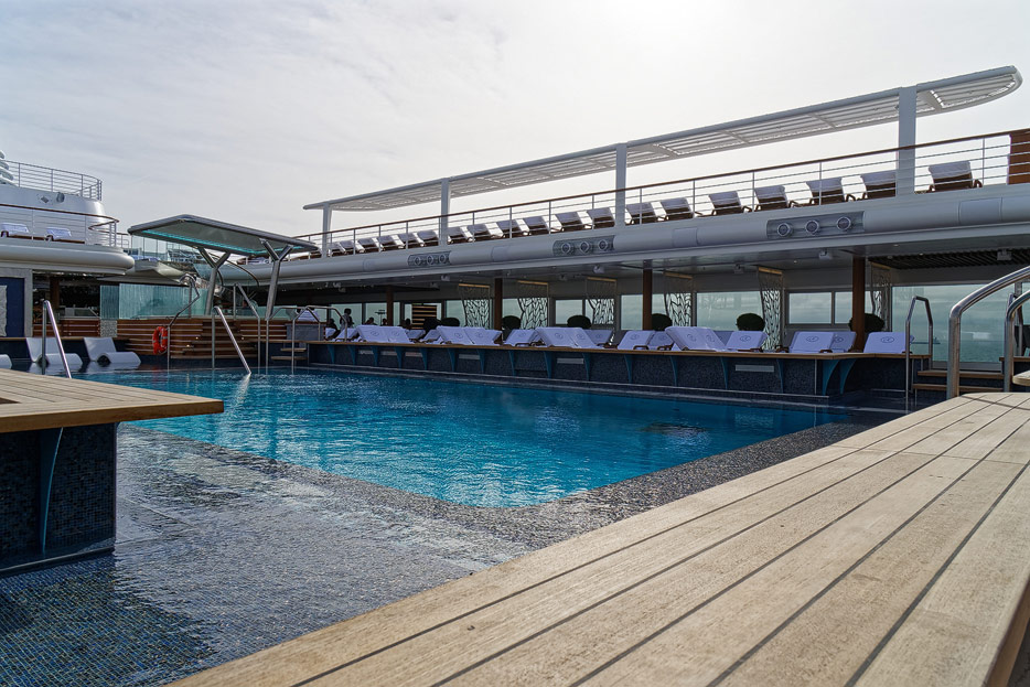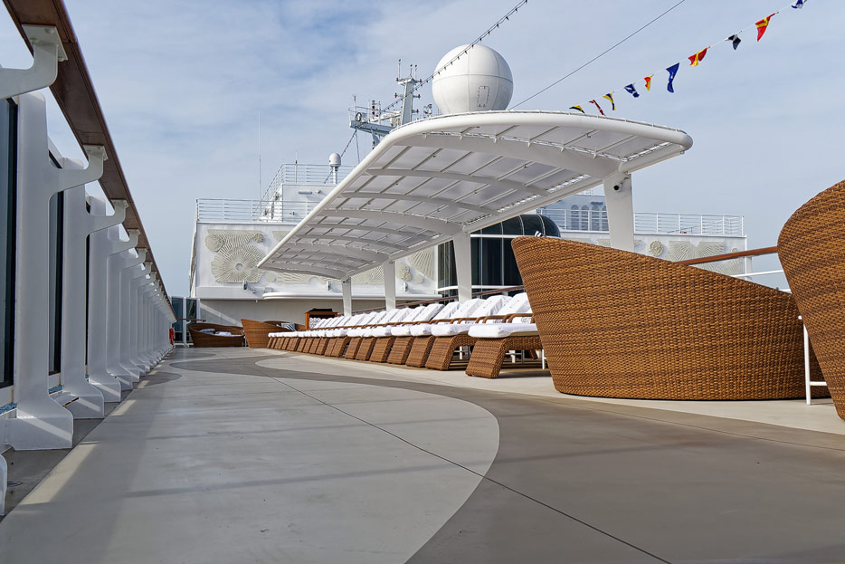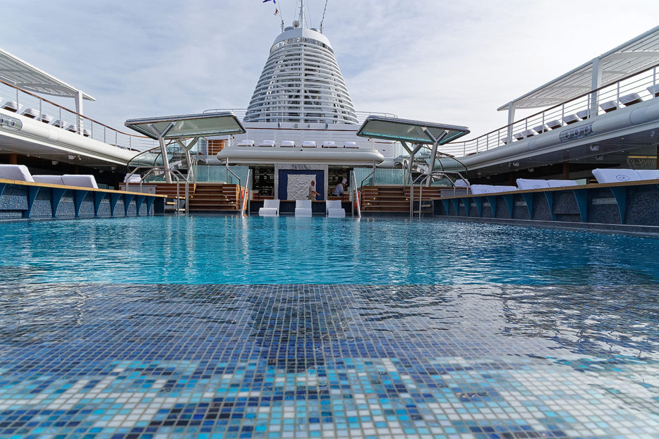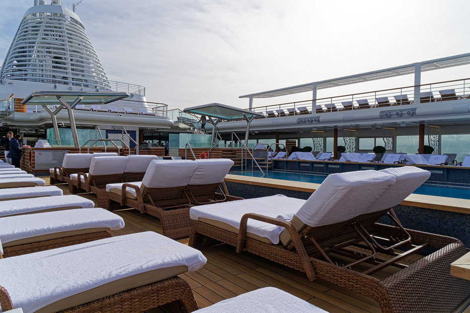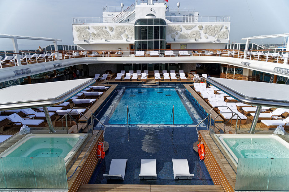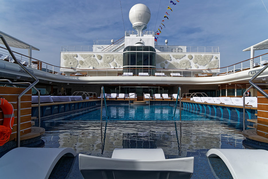 Pool, Infinity-Pool, Sonnendeck, Sportsdeck und Promenadendeck der Seven Seas Splendor