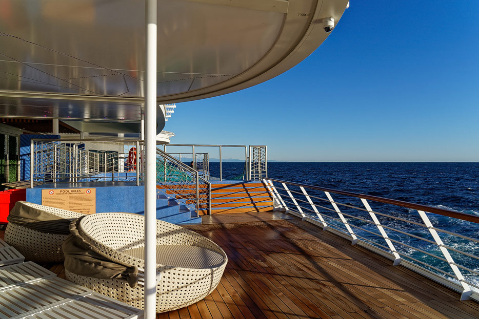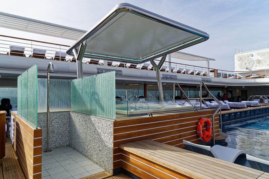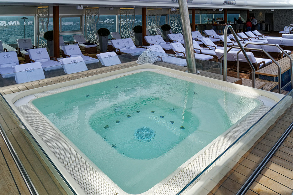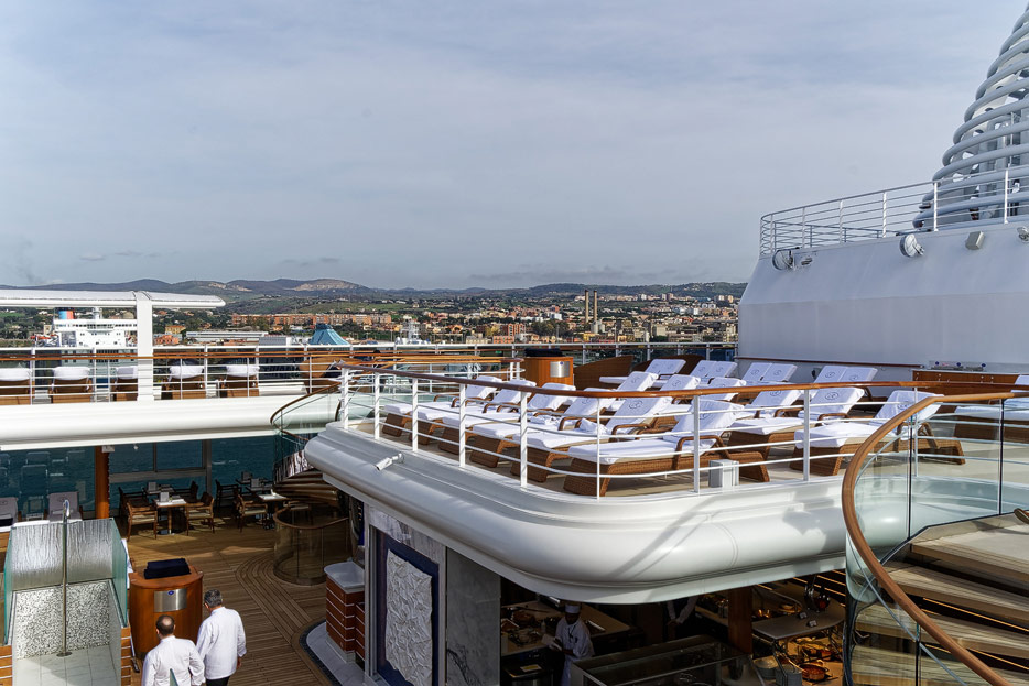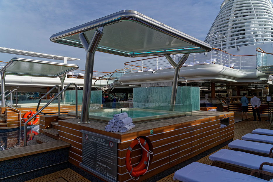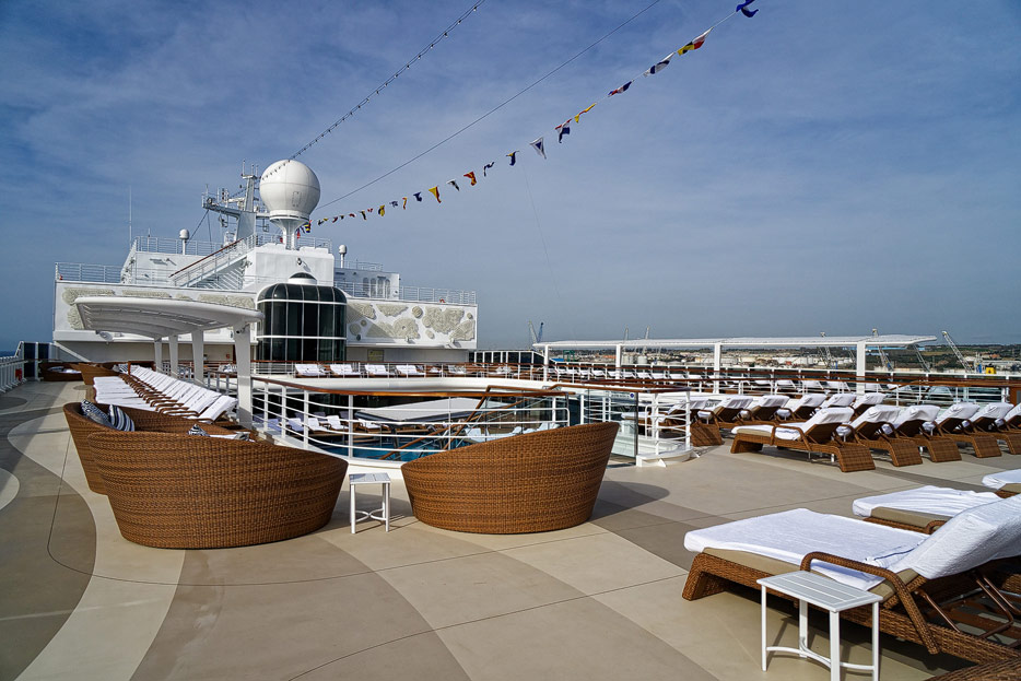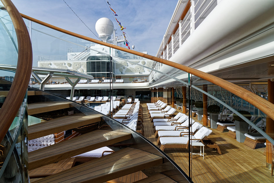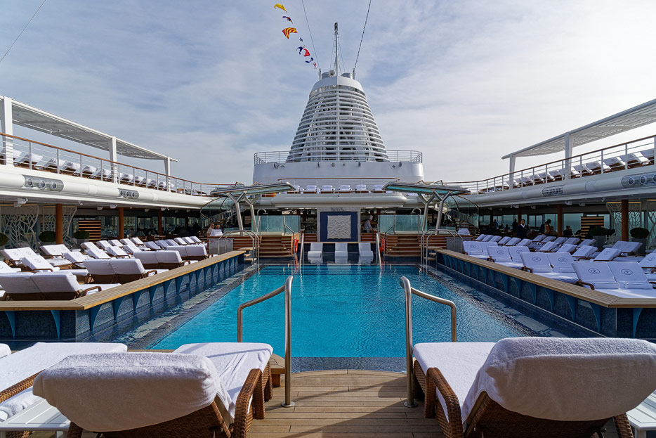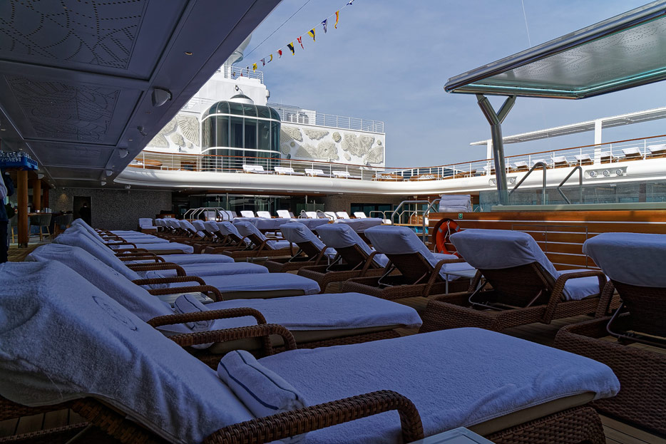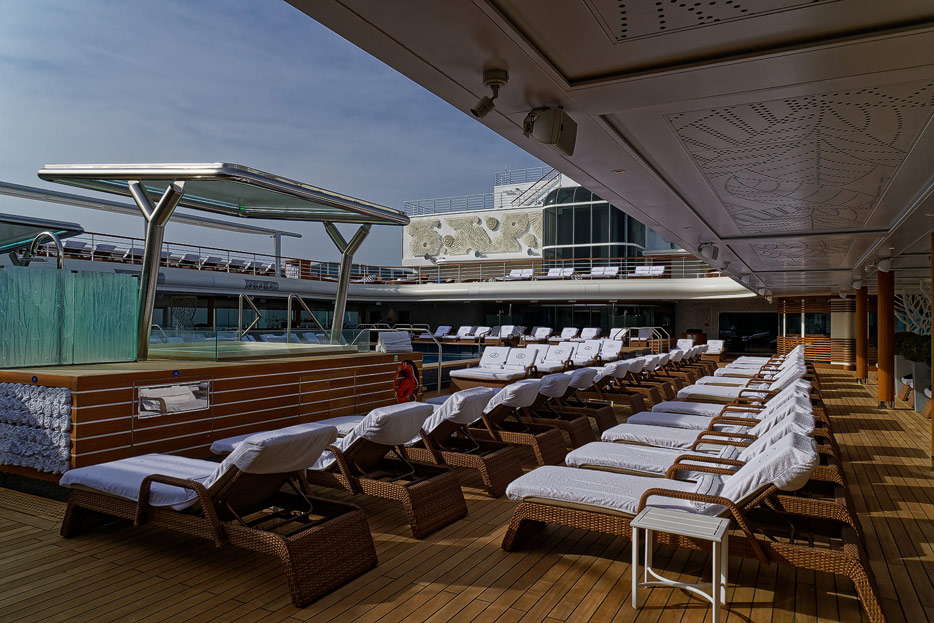 Pool, Infinity-Pool, Sonnendeck, Sportsdeck und Promenadendeck der Seven Seas Splendor