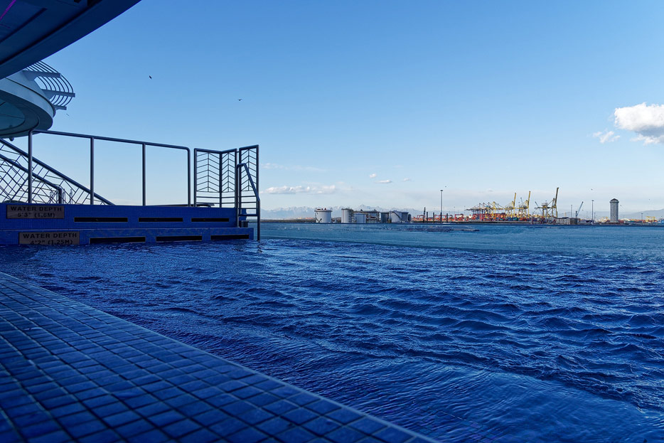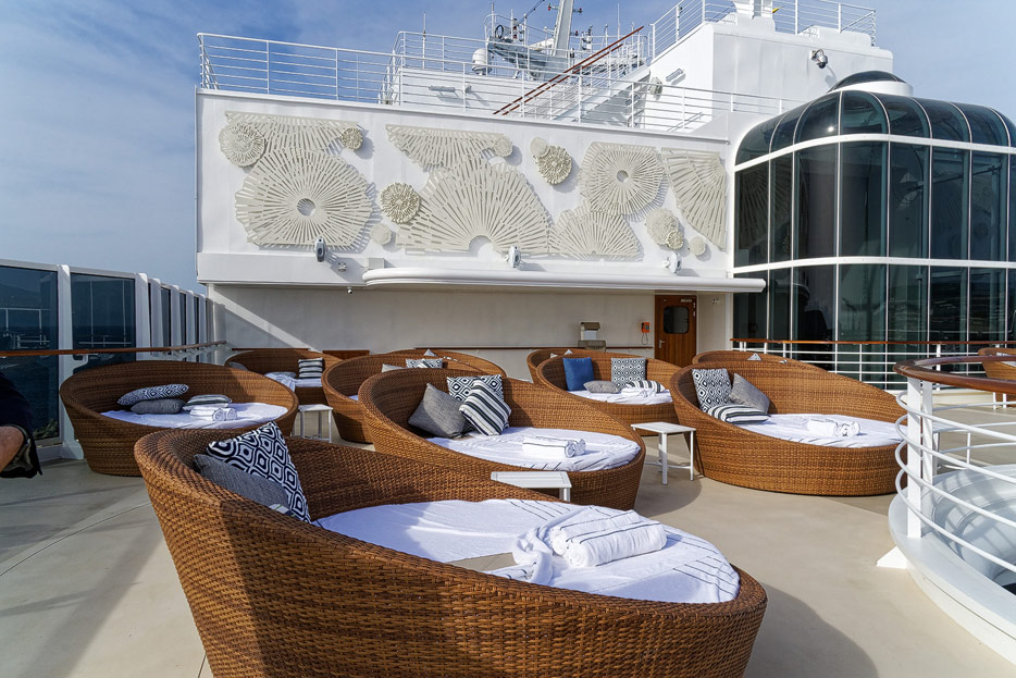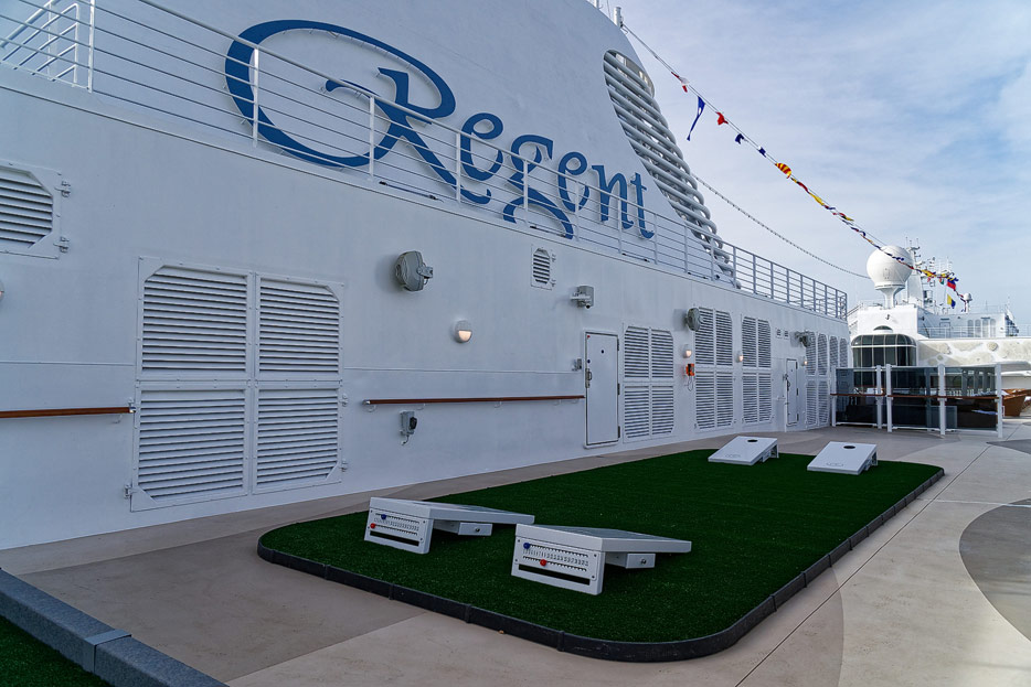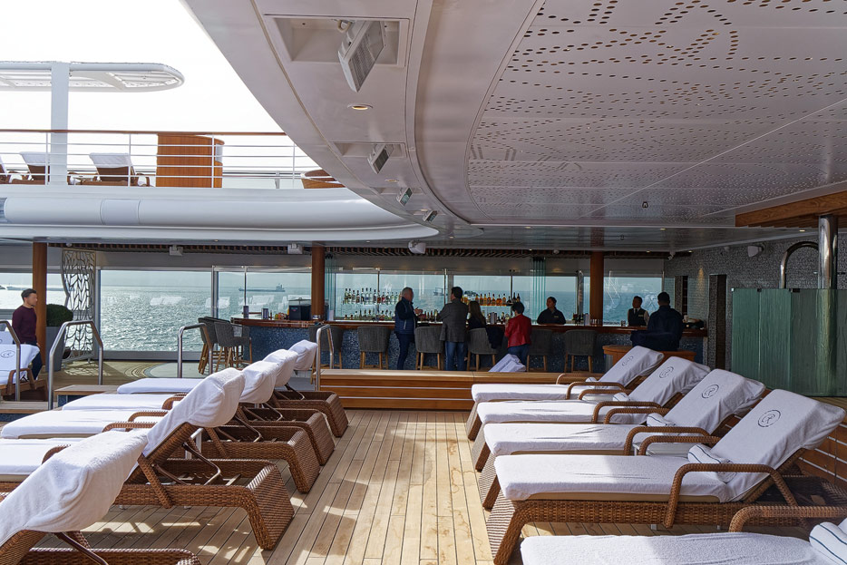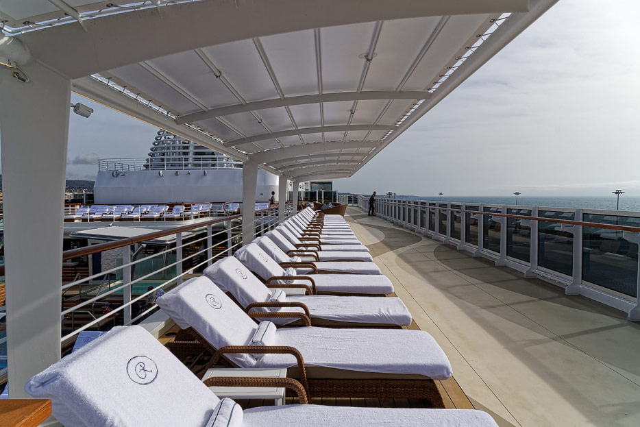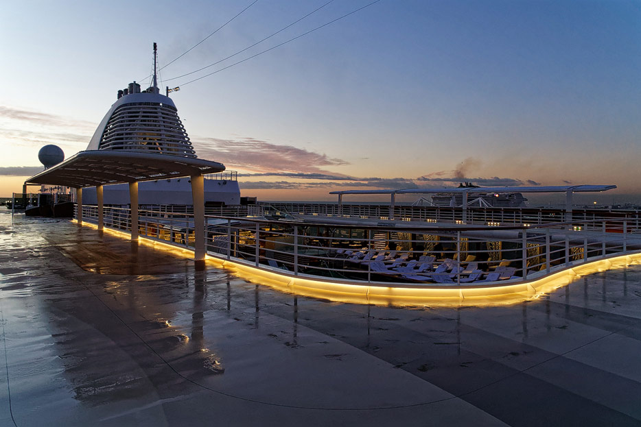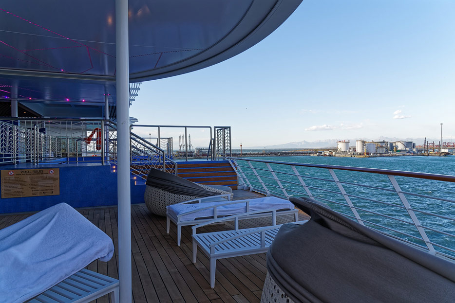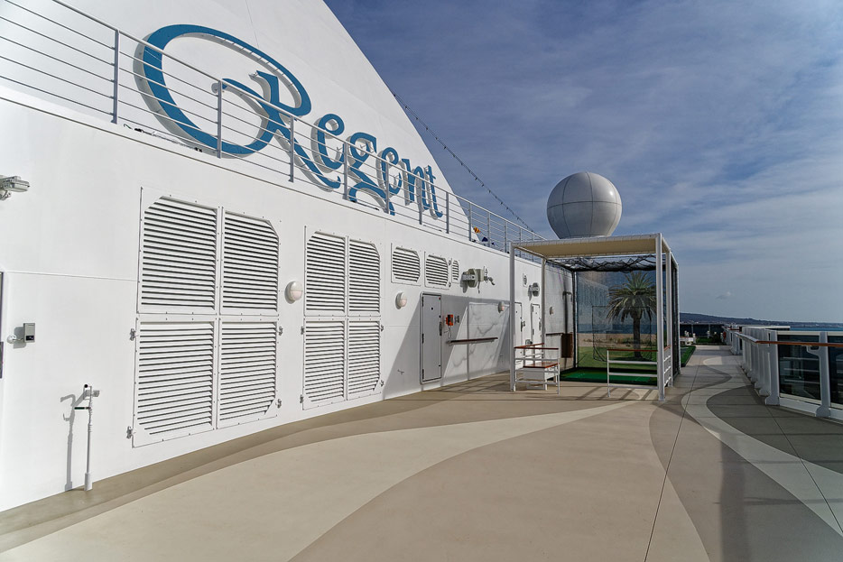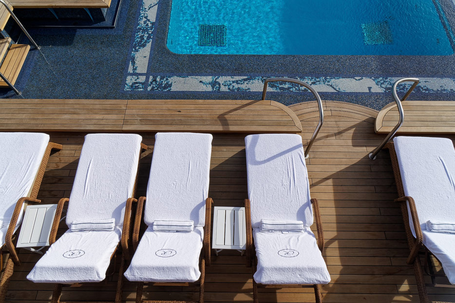 Pool, Infinity-Pool, Sonnendeck, Sportsdeck und Promenadendeck der Seven Seas Splendor