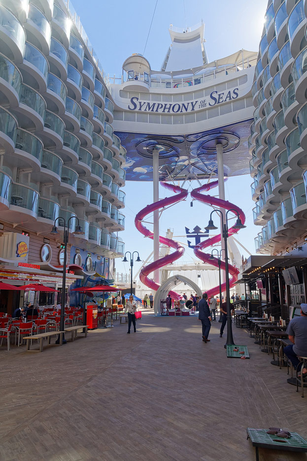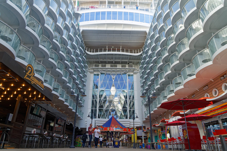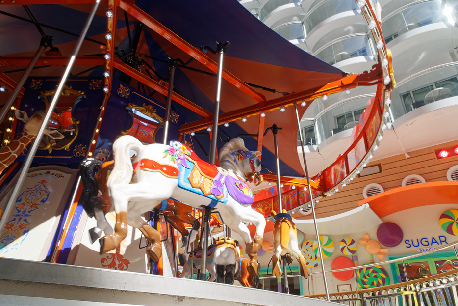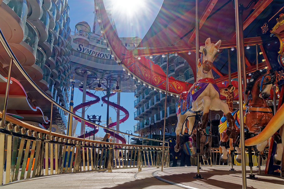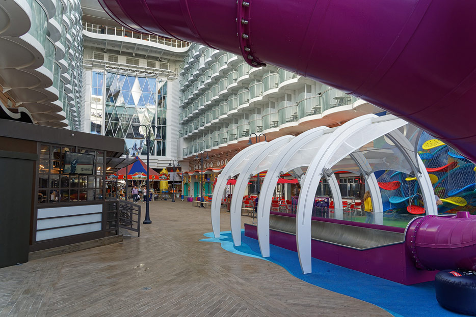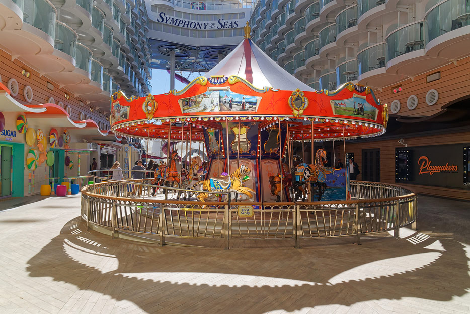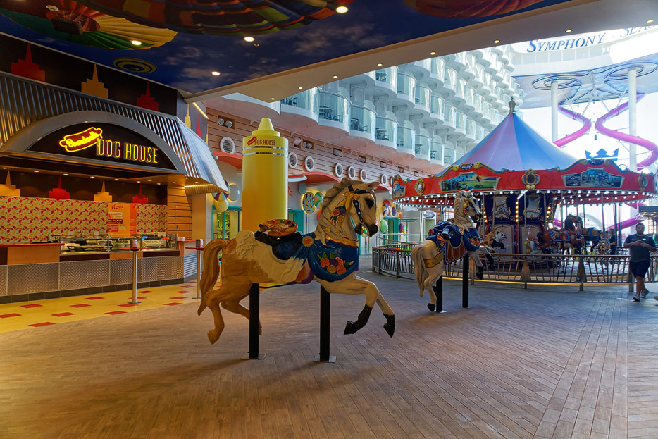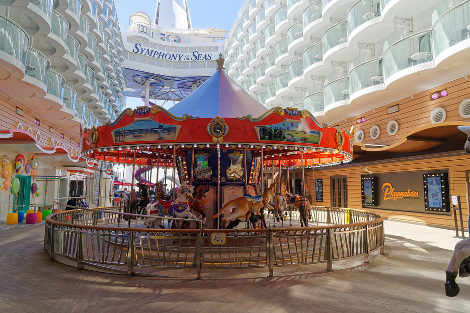 Boardwalk-Bereich der Symphony of the Seas inklusive Aqua Theater, The Ultimate Abyss und Karussell