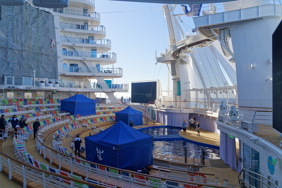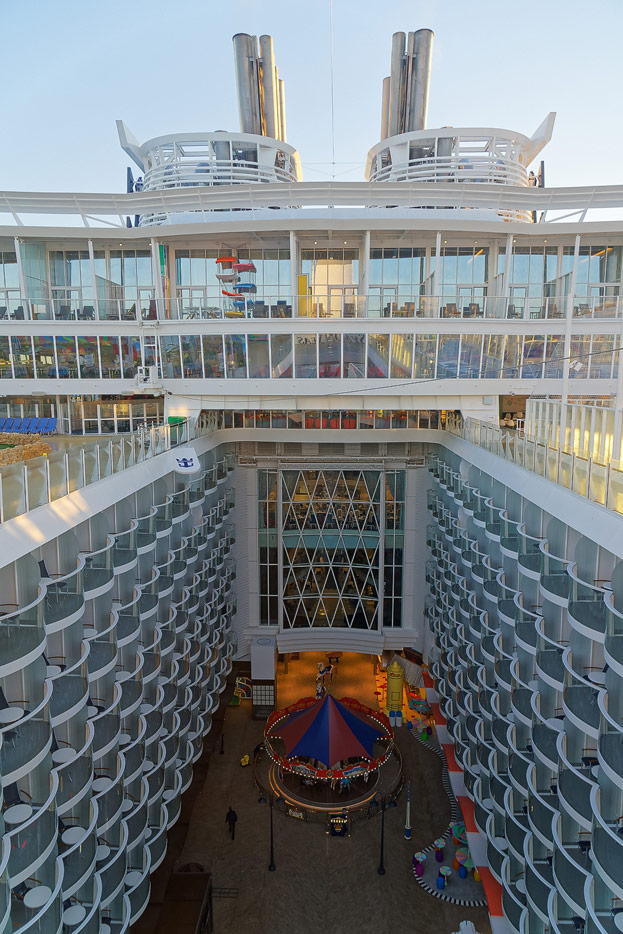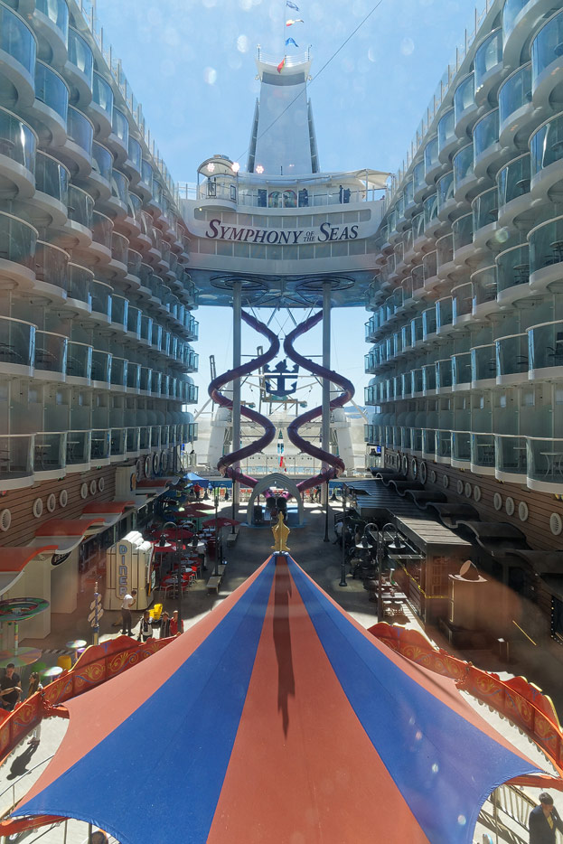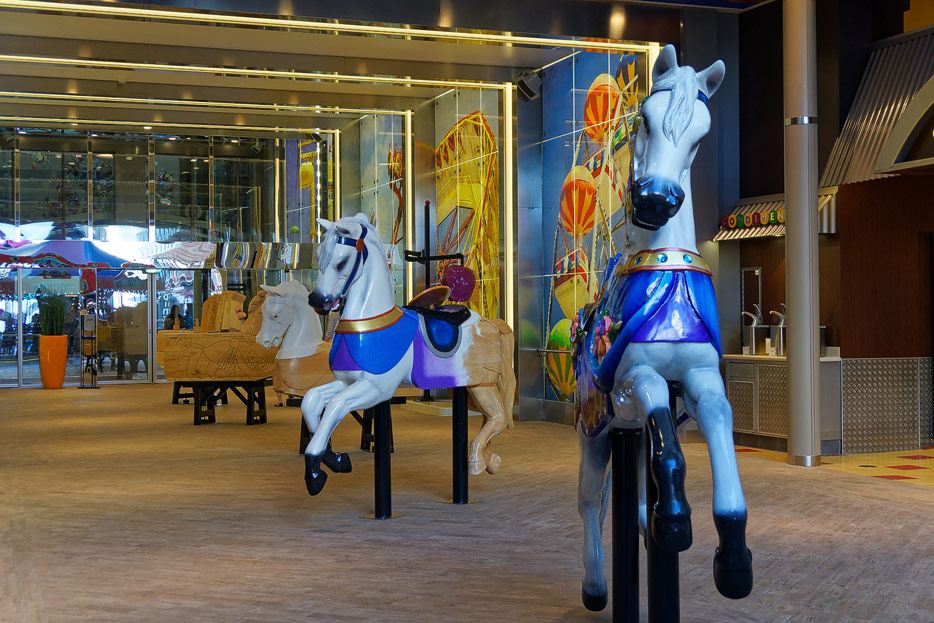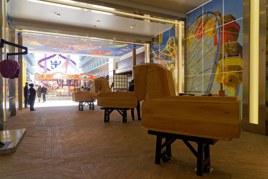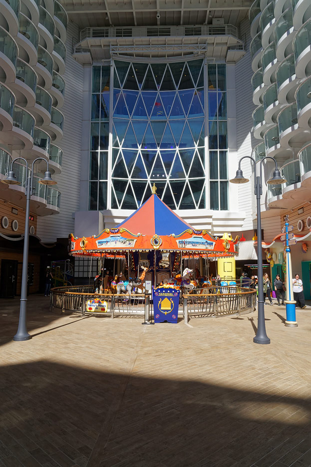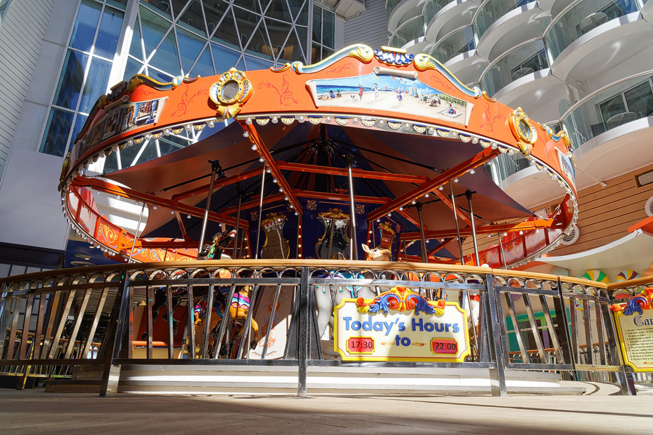 Boardwalk-Bereich der Symphony of the Seas inklusive Aqua Theater, The Ultimate Abyss und Karussell
