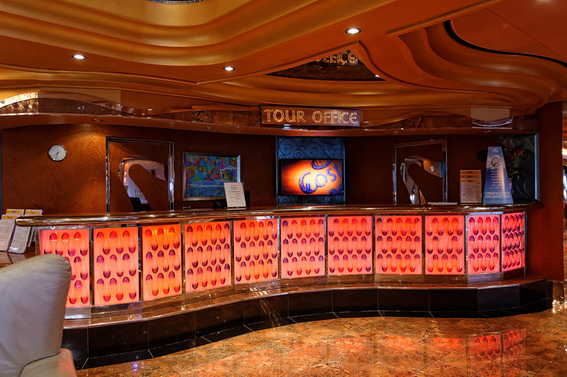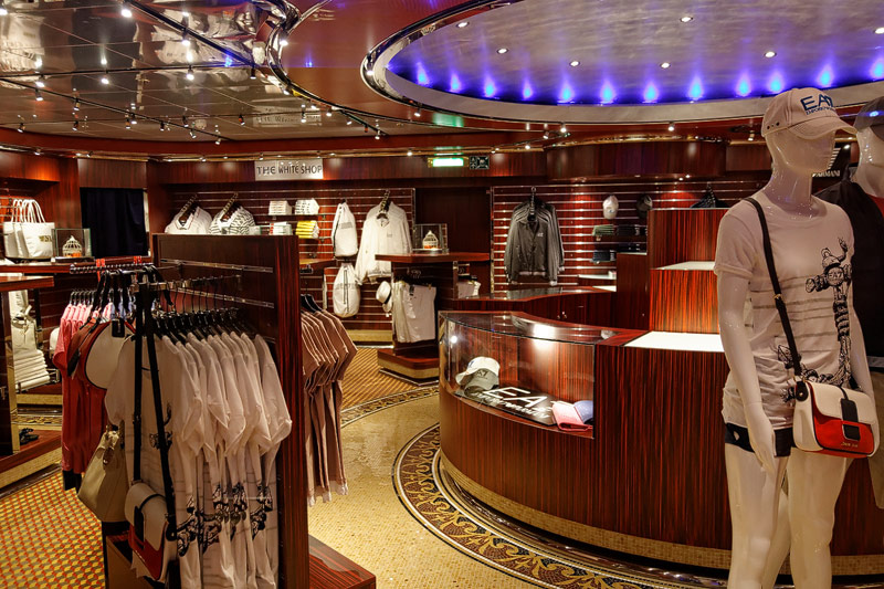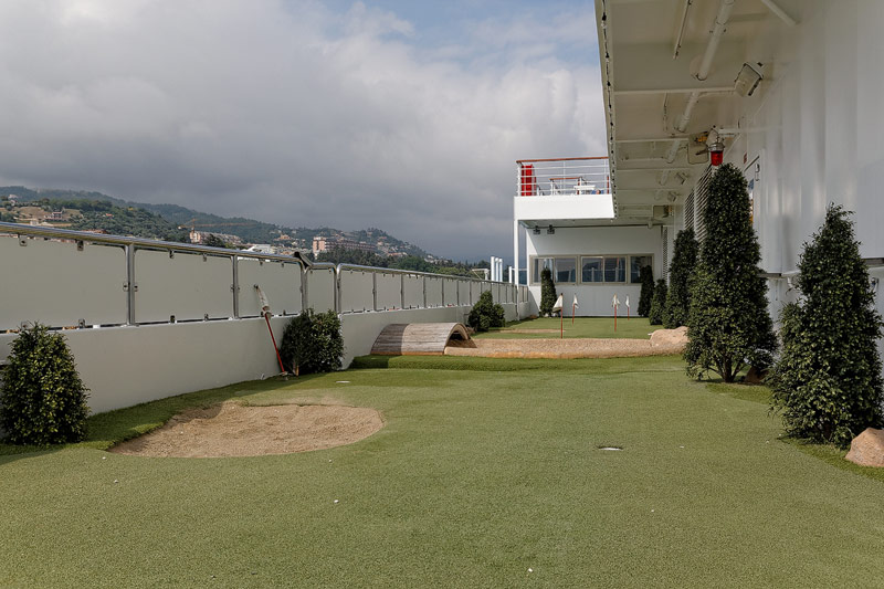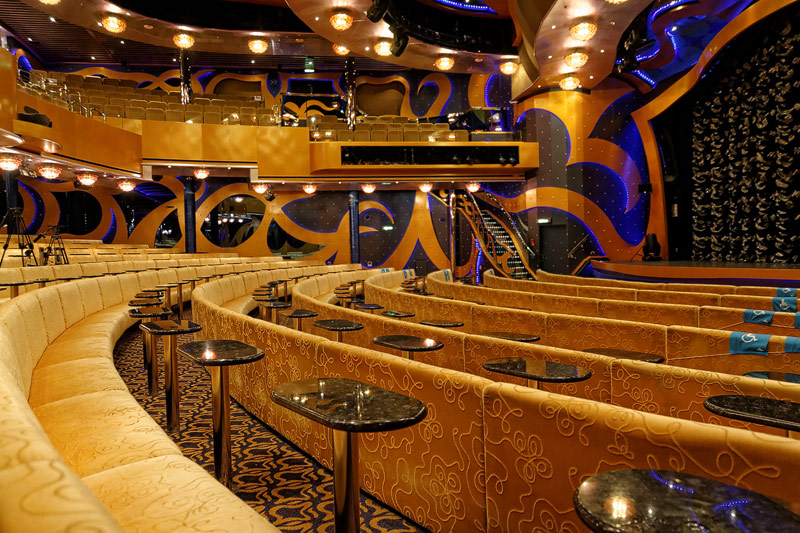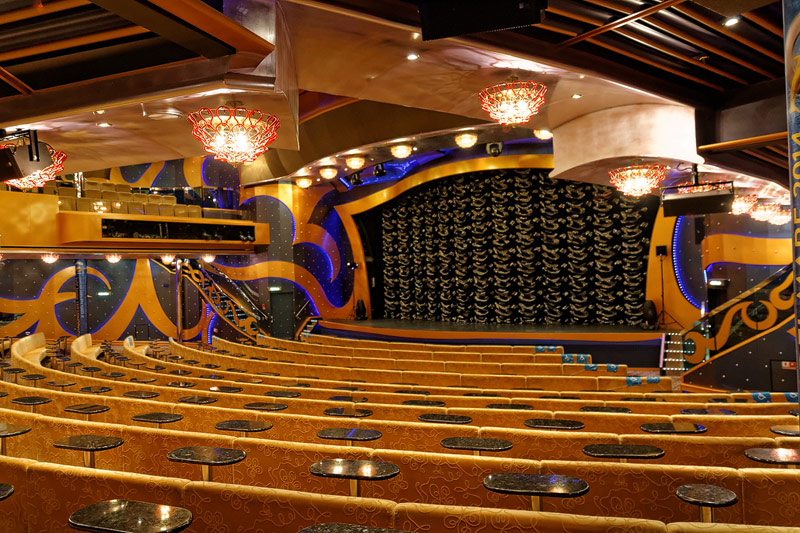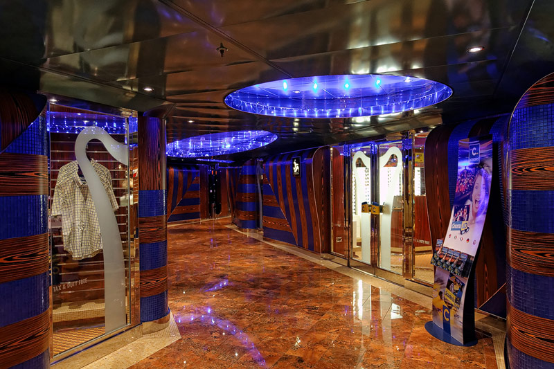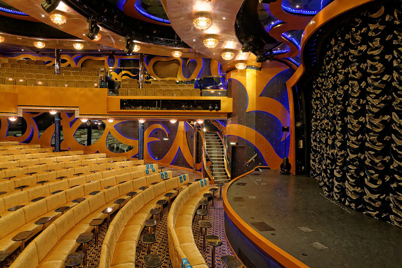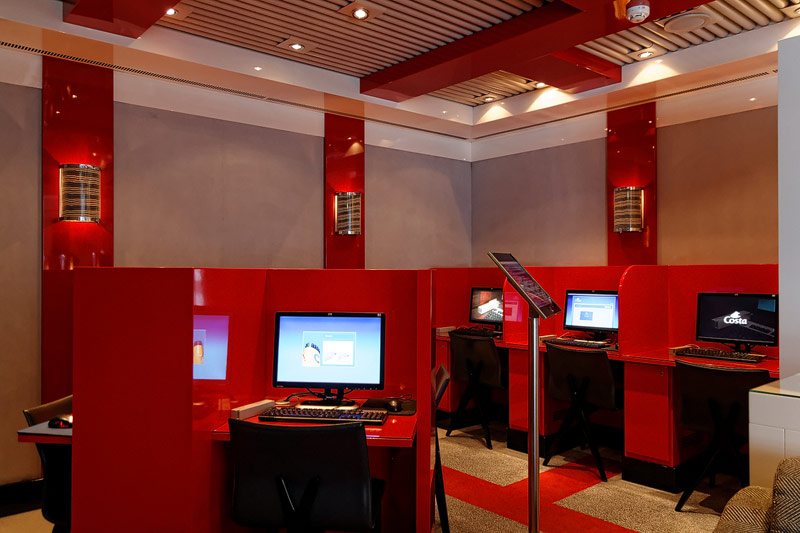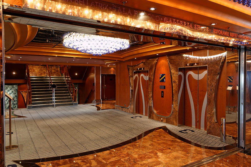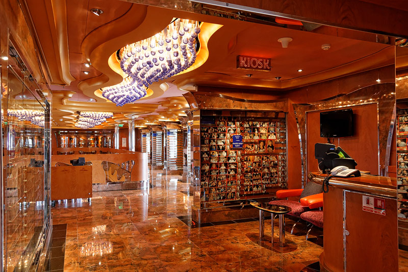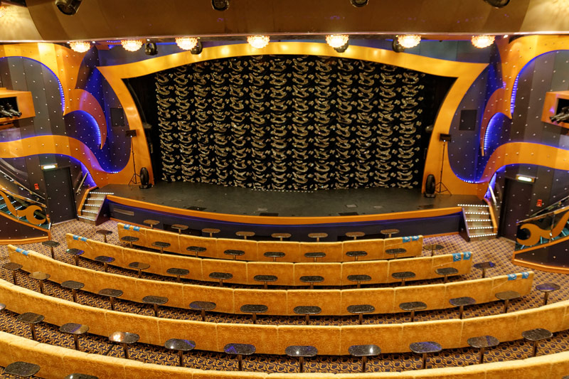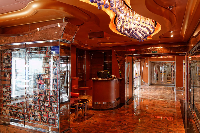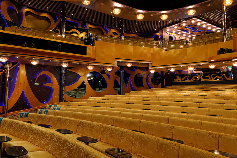 weitere Bereiche der Costa Luminosa: 4D-Kino, Formel-1-Simulator, Golf-Simulator, Bibliothek, Kapelle, Spielkasino, Rezeption und Tour-Desk, Shops, Theater, Treppenhaus und Orientierung