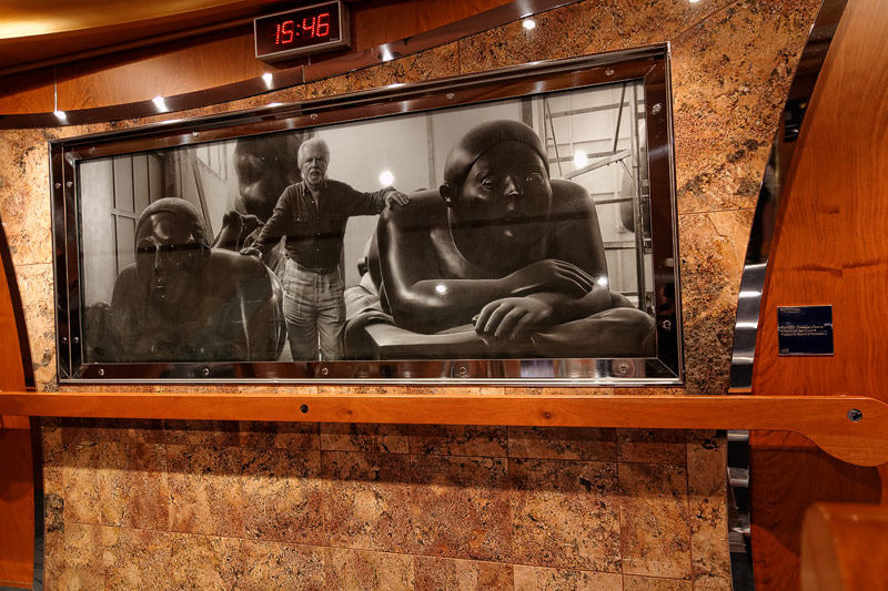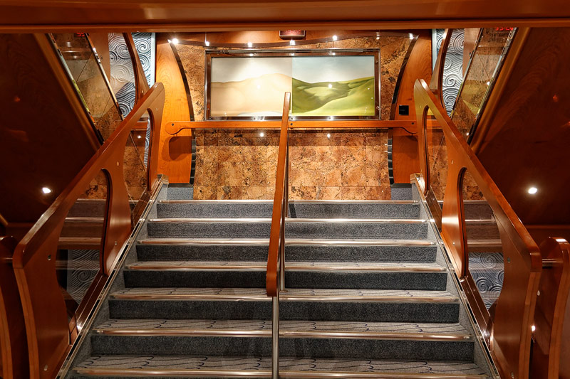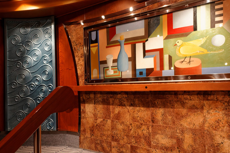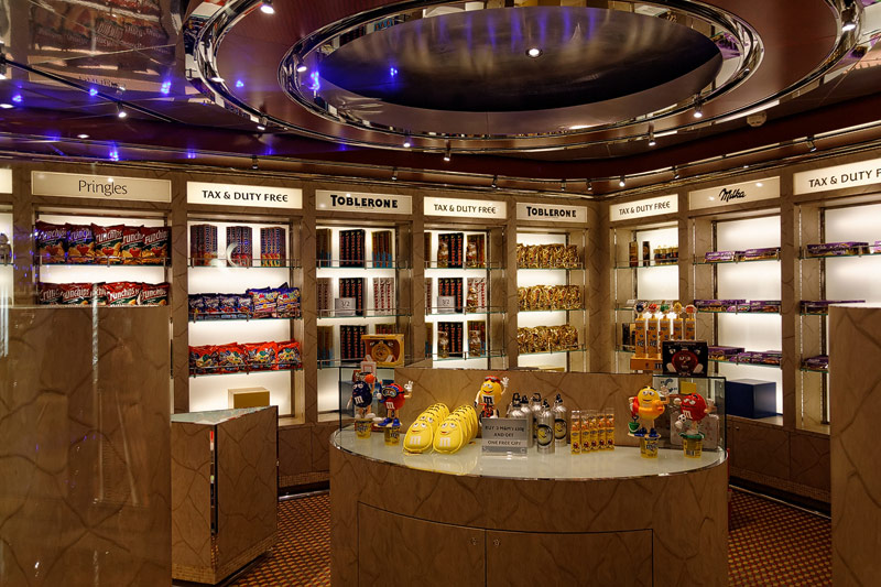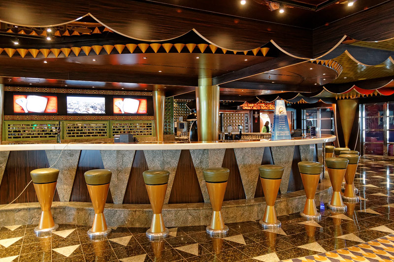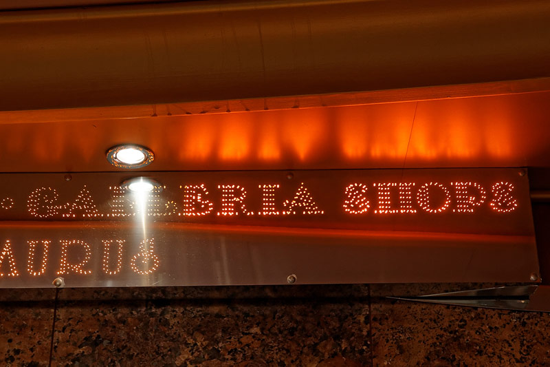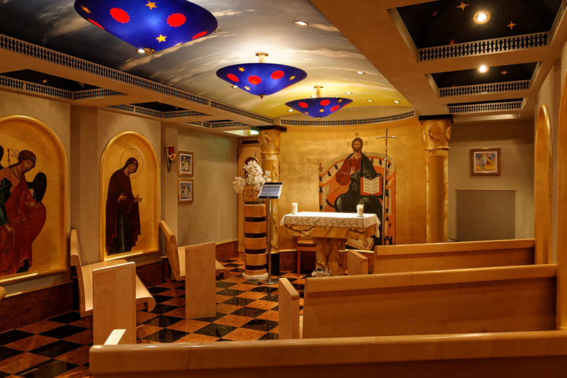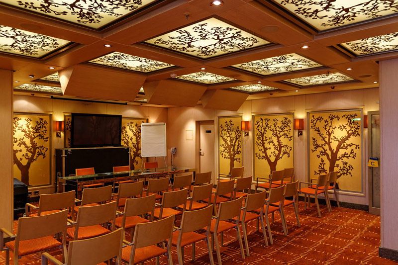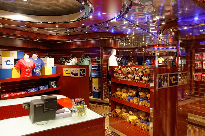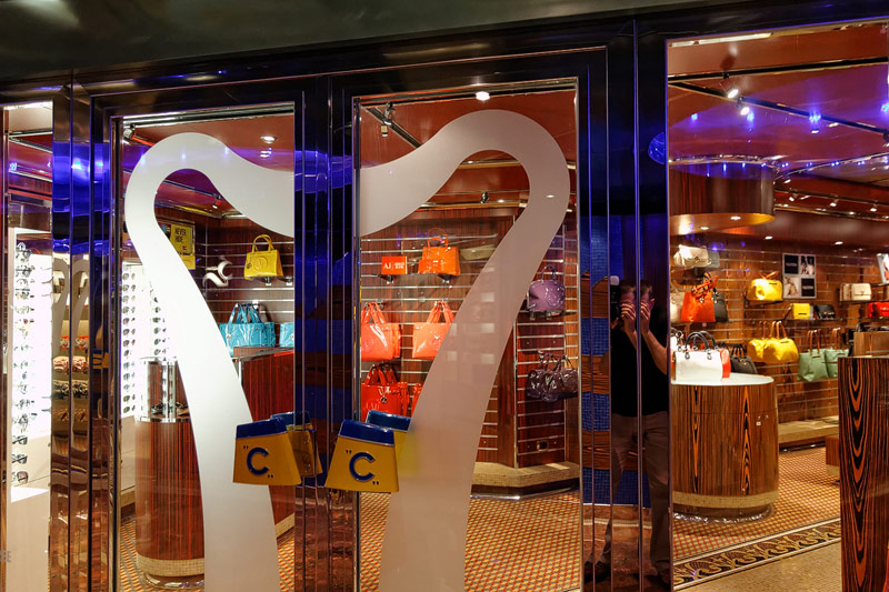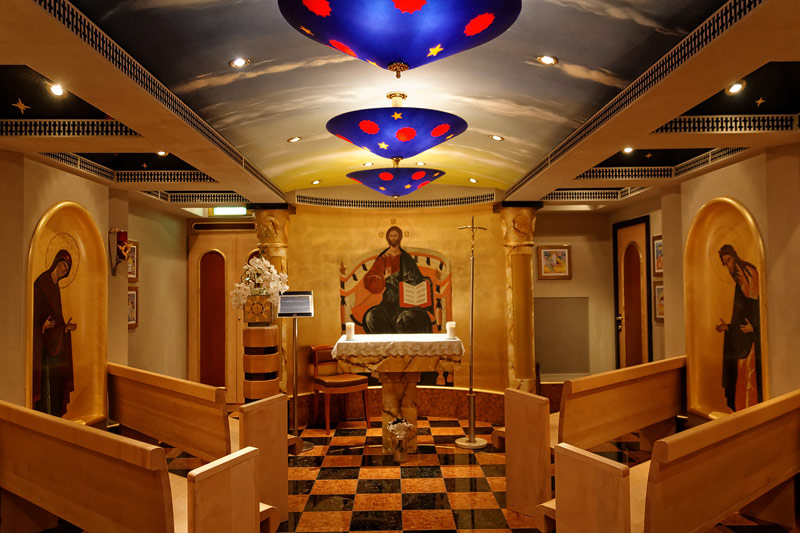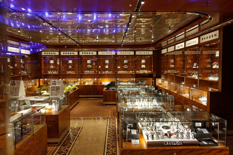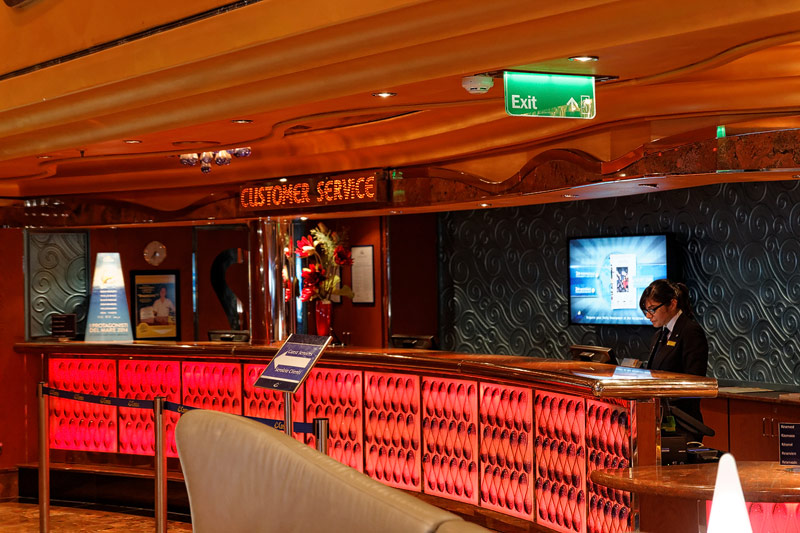 weitere Bereiche der Costa Luminosa: 4D-Kino, Formel-1-Simulator, Golf-Simulator, Bibliothek, Kapelle, Spielkasino, Rezeption und Tour-Desk, Shops, Theater, Treppenhaus und Orientierung